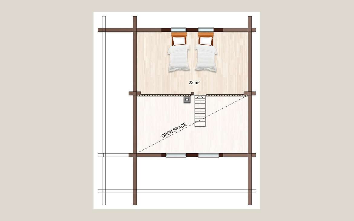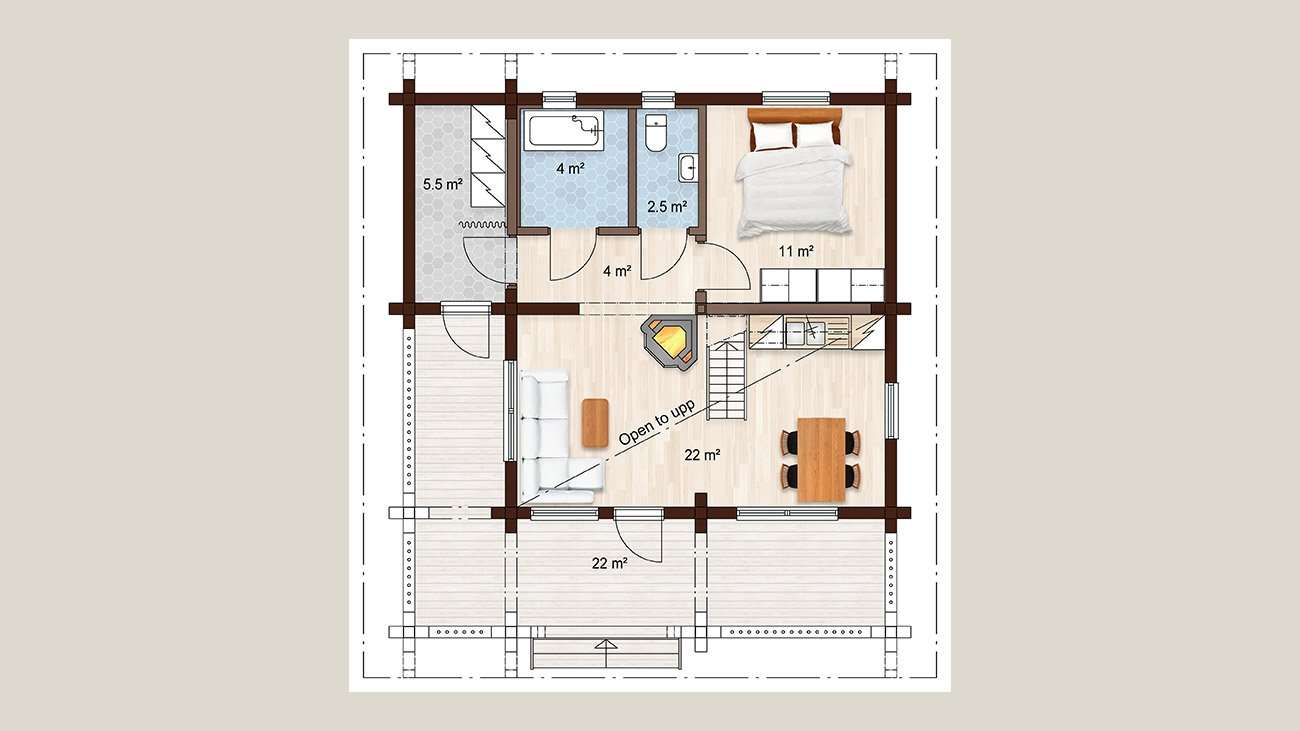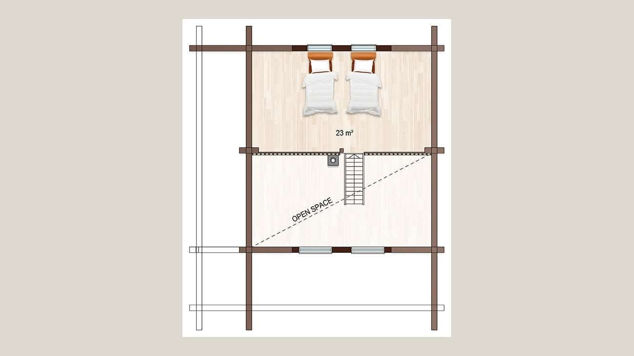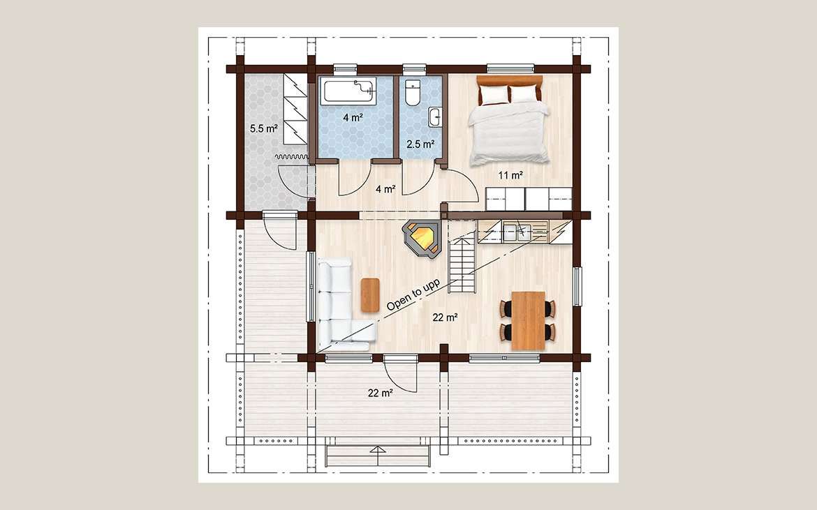 Tieva ist ein Holzhaus von Aito Lapland, einem Hersteller von Häusern mit Sitz in Finnland. Dieses Holzhaus hat zwei Schlafzimmer und bietet 64m2 Wohnfläche auf zwei Etagen.