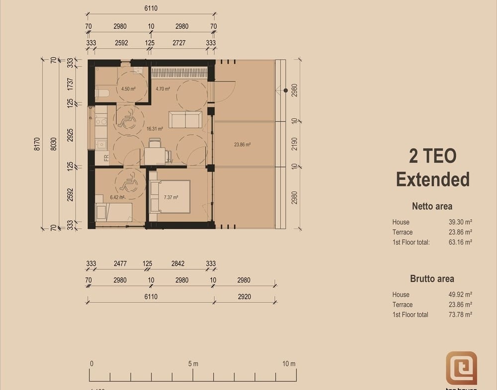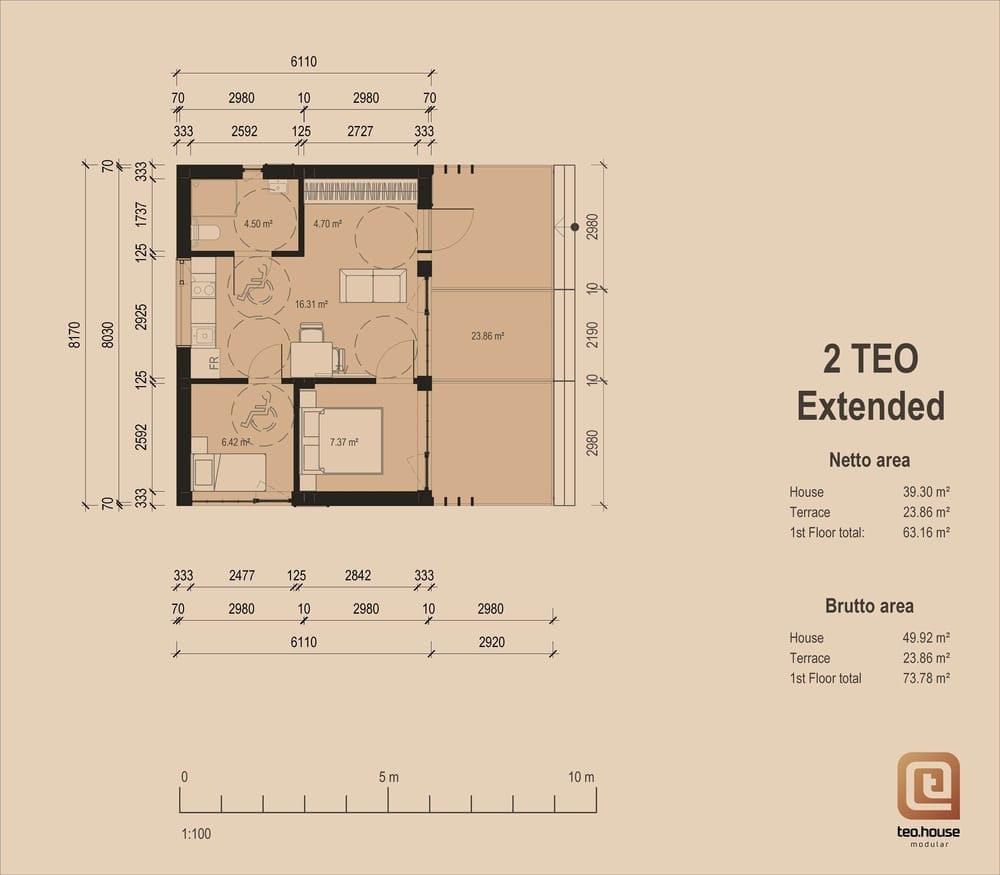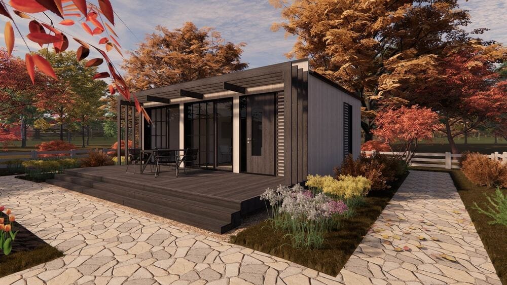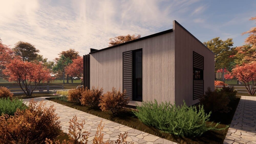 2 Teo Extended ist ein Fertighaus von CompactLiving, einem Hersteller von Fertighäusern mit Sitz in Estland. Dieses Fertighaus bietet 50 m² Wohnfläche mit 2 Schlafzimmern und 1 Badezimmer.