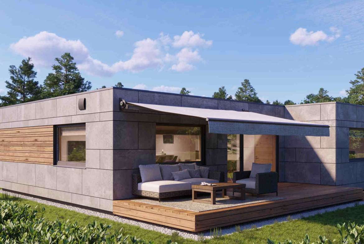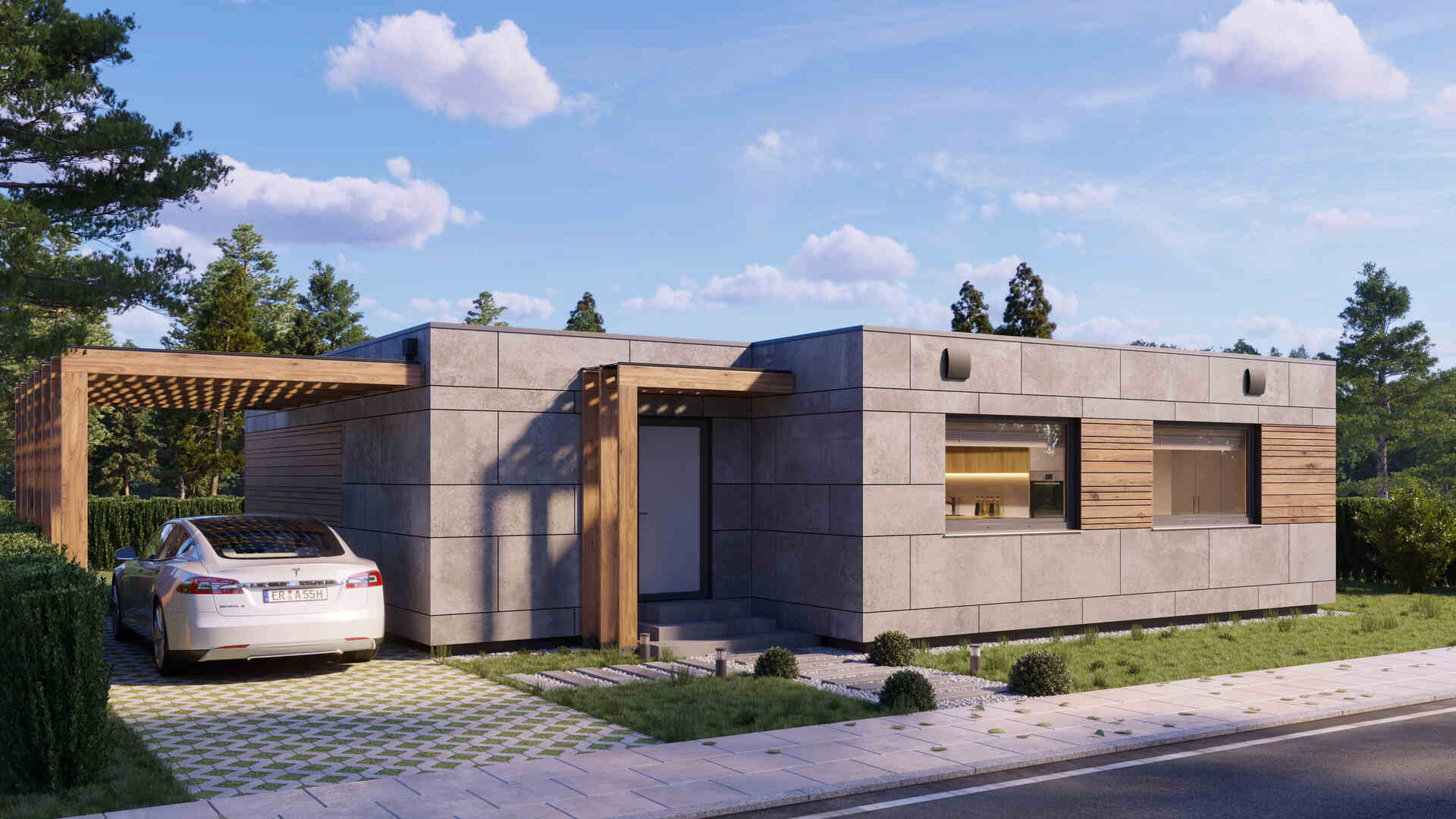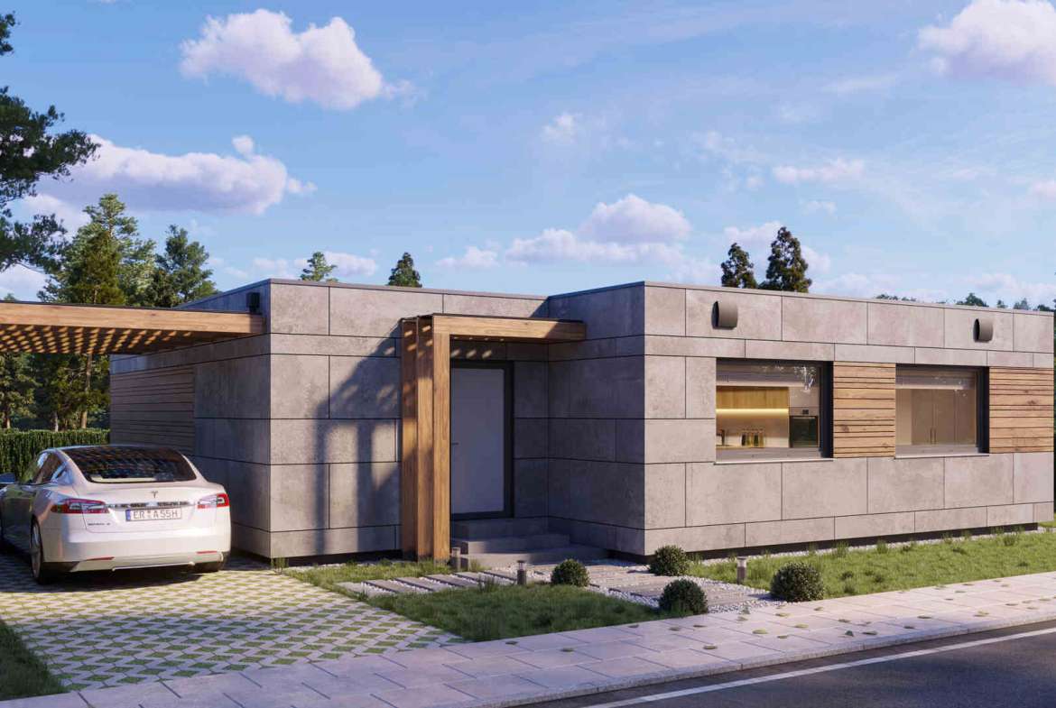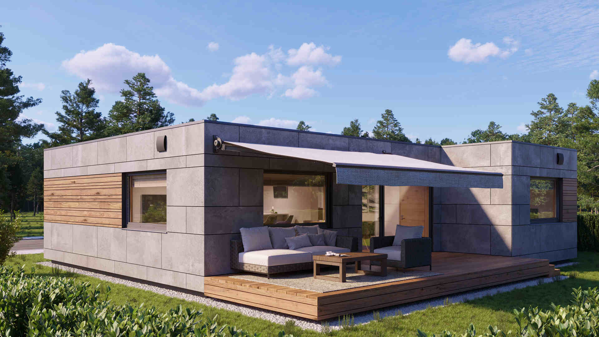 TRIOMOD 94 V1 ist ein modulares Haus von NOVA TEQ, einem Hersteller von Fertighäusern mit Sitz in der Ukraine. Dieses Modulhaus bietet 77 m² Wohnfläche, zwei Schlafzimmer und ein Badezimmer.