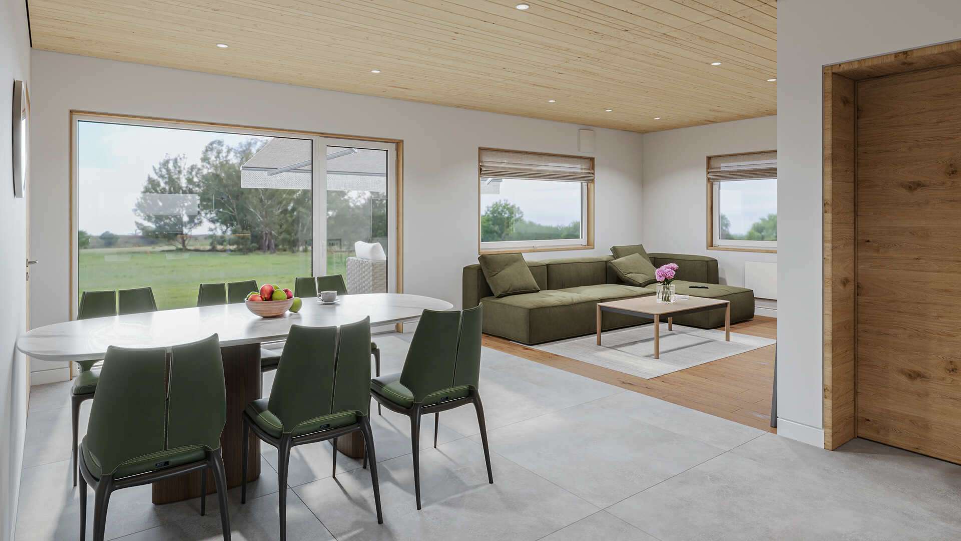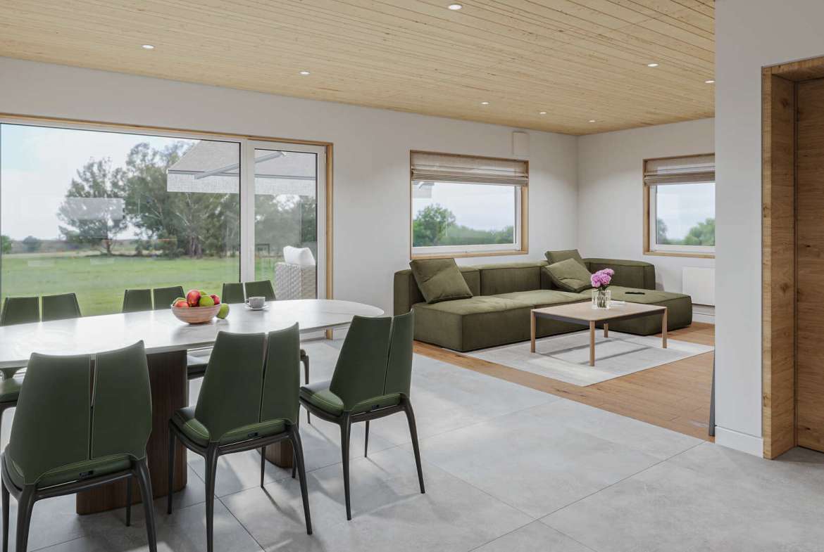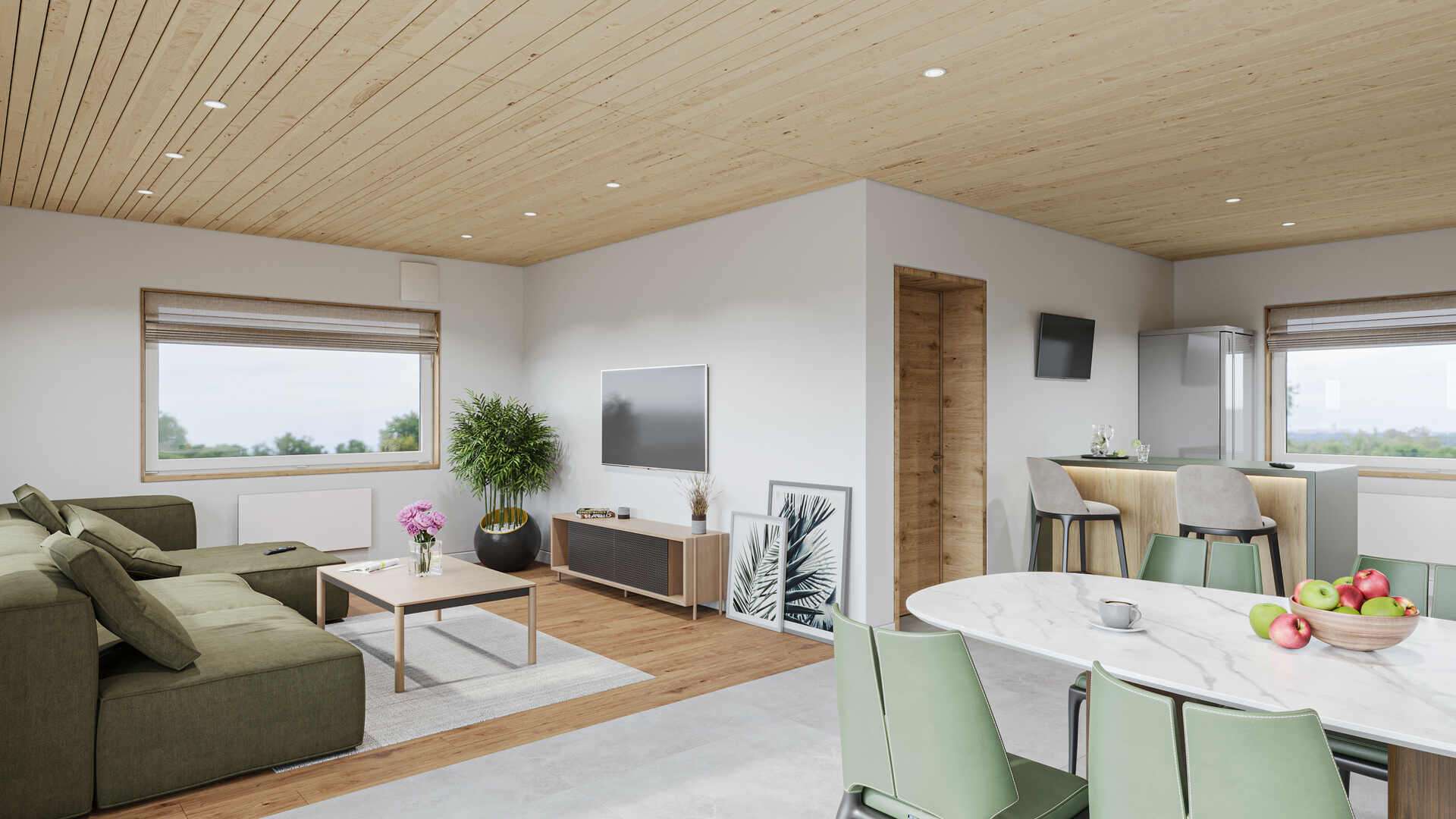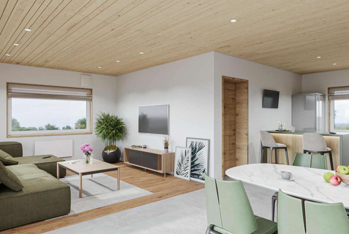 TRIOMOD 94 V1 ist ein modulares Haus von NOVA TEQ, einem Hersteller von Fertighäusern mit Sitz in der Ukraine. Dieses Modulhaus bietet 77 m² Wohnfläche, zwei Schlafzimmer und ein Badezimmer.