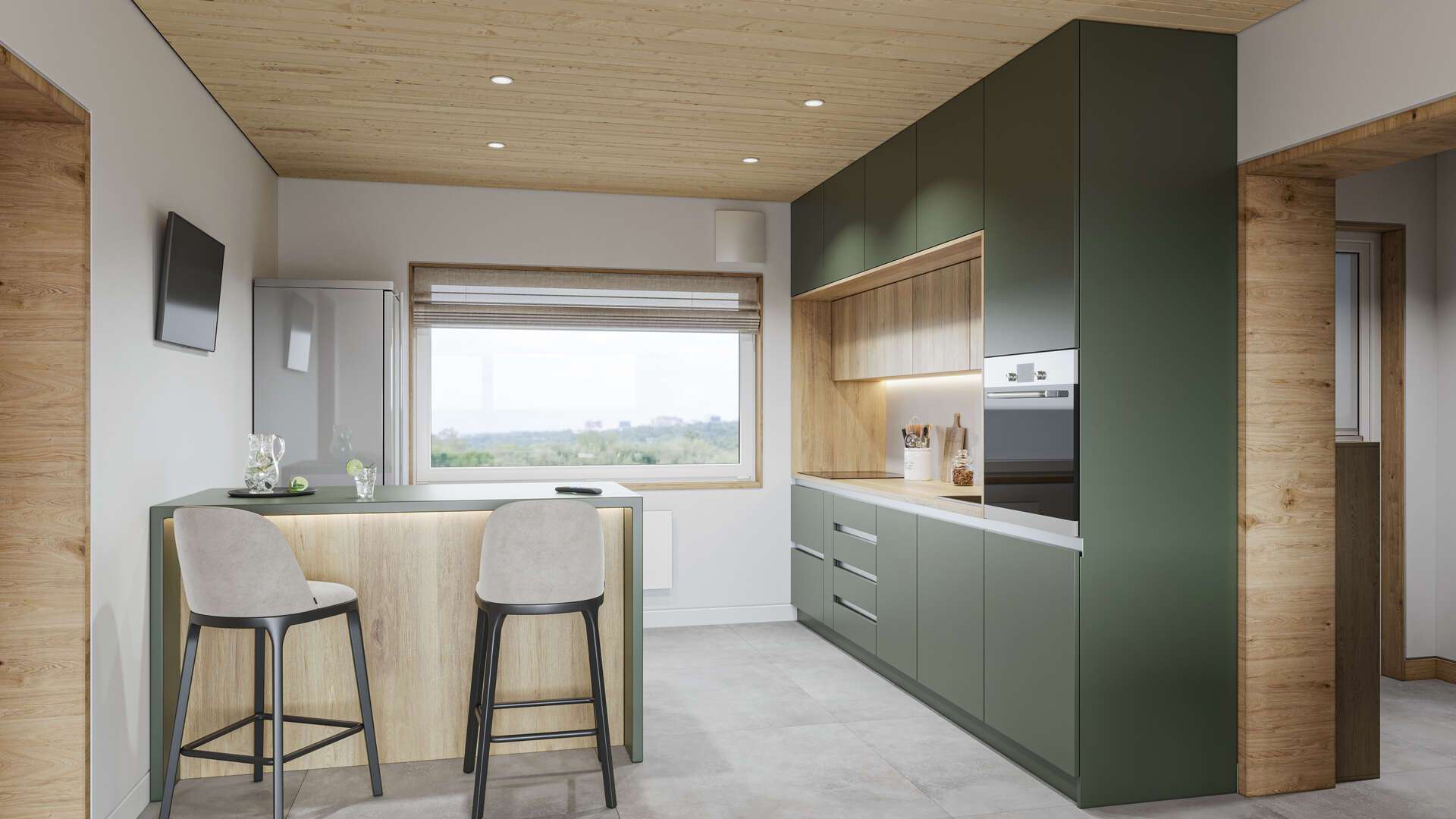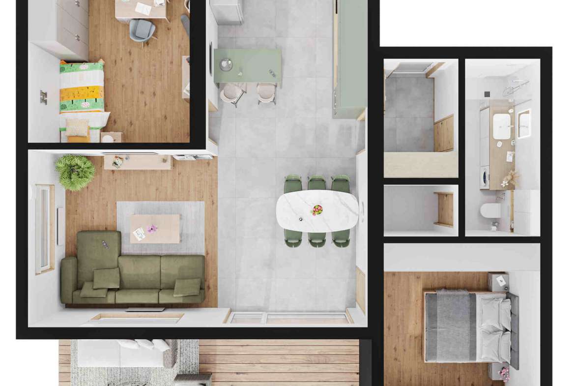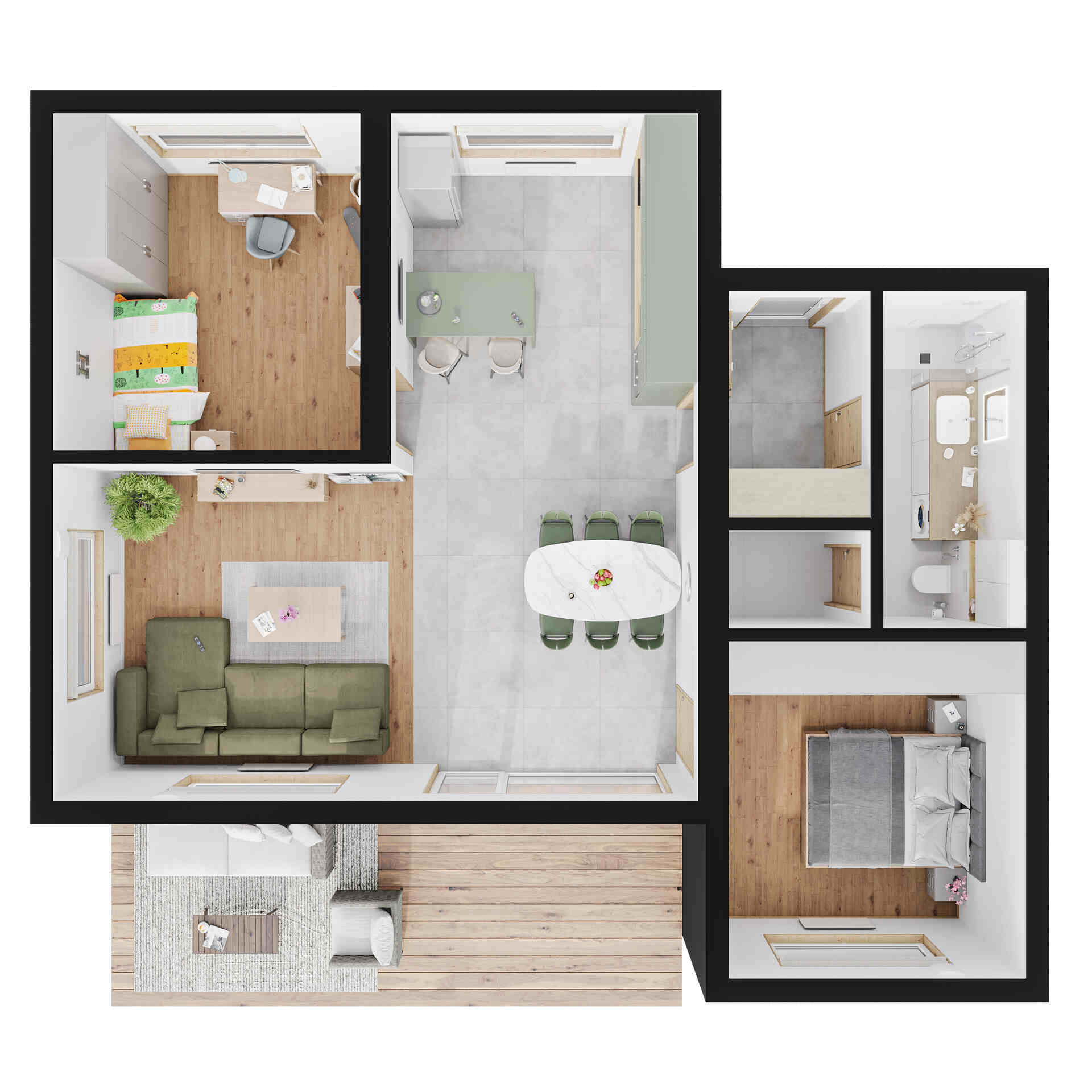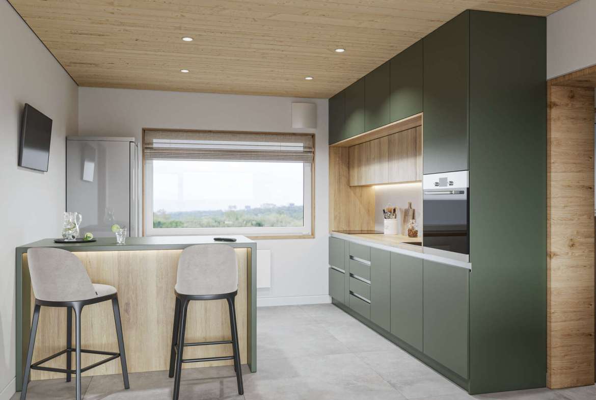 TRIOMOD 94 V1 ist ein modulares Haus von NOVA TEQ, einem Hersteller von Fertighäusern mit Sitz in der Ukraine. Dieses Modulhaus bietet 77 m² Wohnfläche, zwei Schlafzimmer und ein Badezimmer.