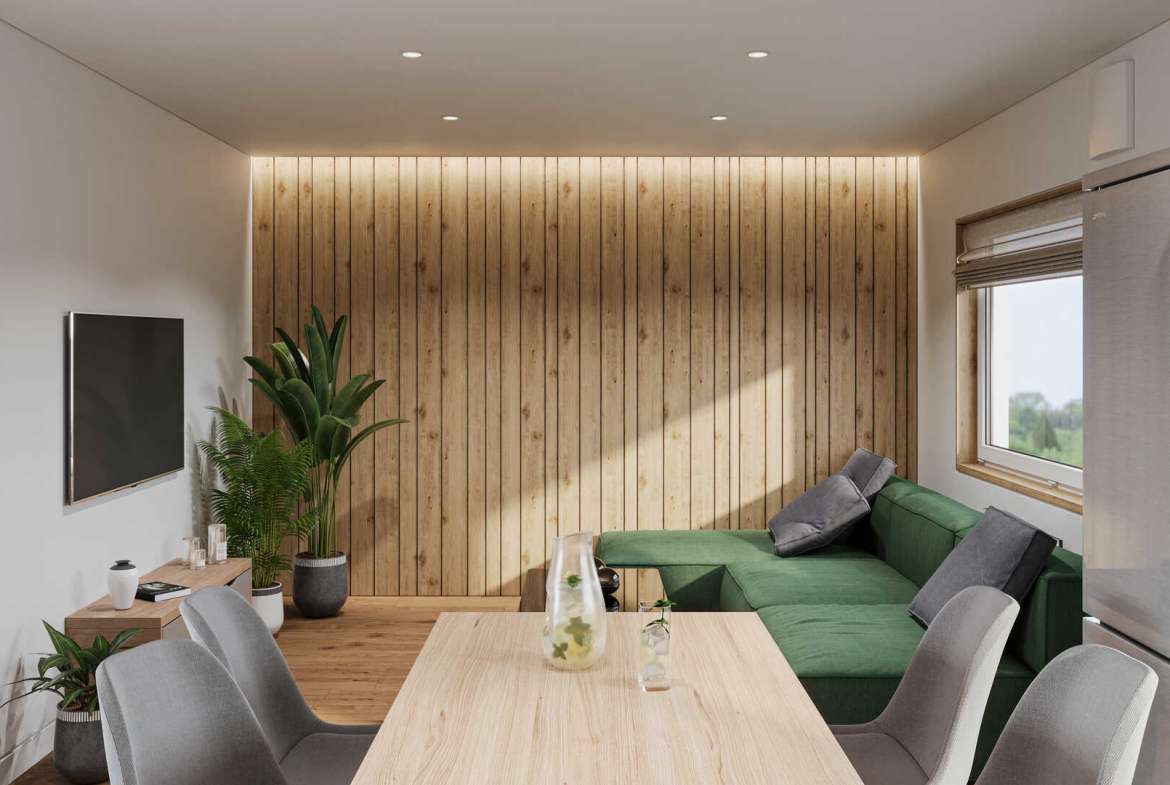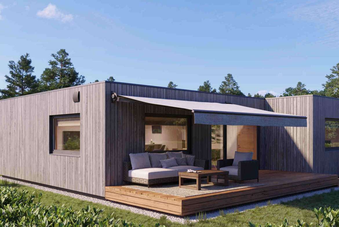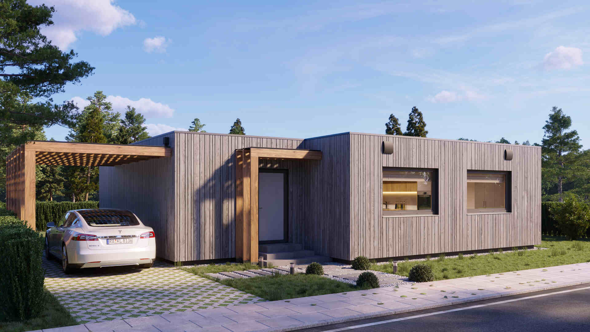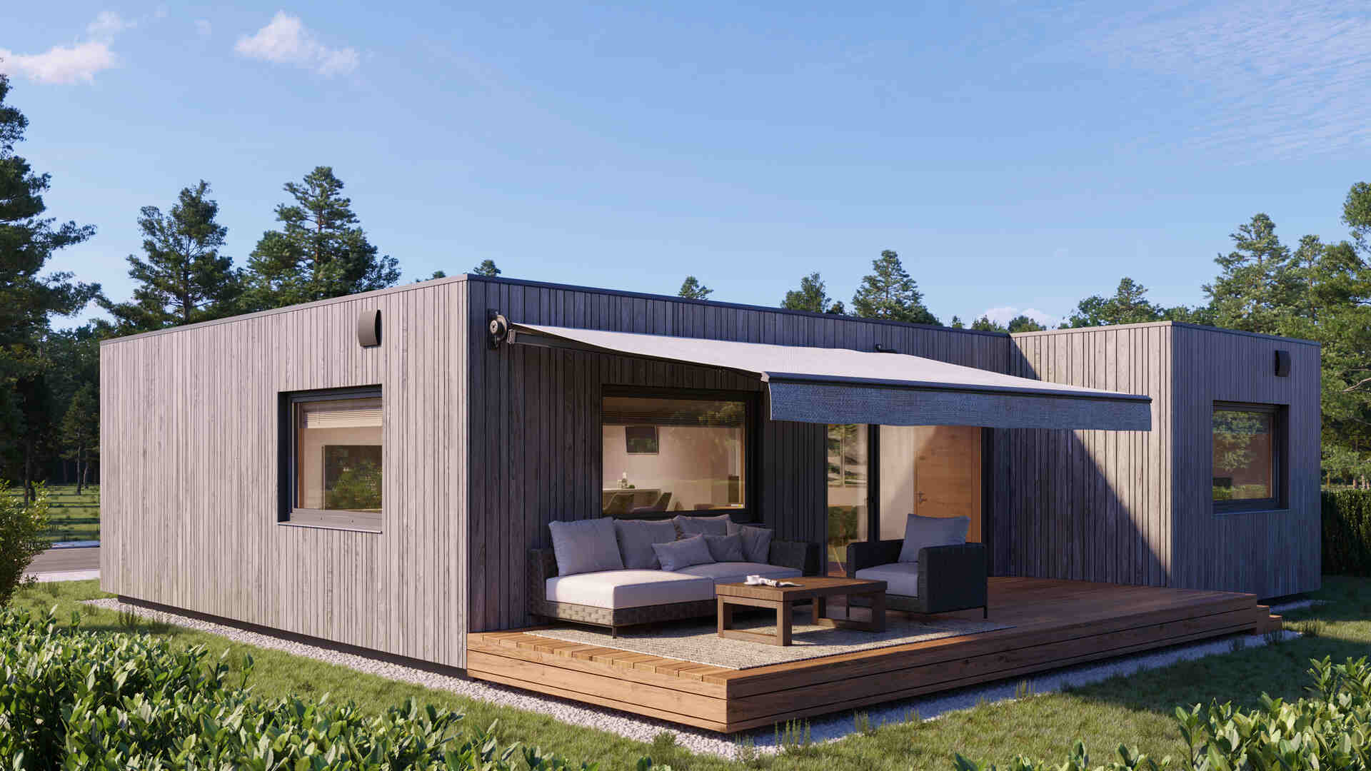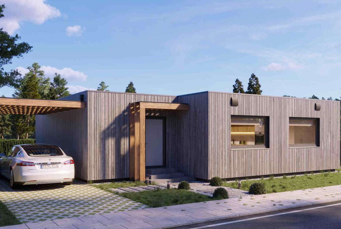 TRIOMOD 94 V2 ist ein modulares Haus von NOVA TEQ, einem Hersteller von Fertighäusern mit Sitz in der Ukraine. Dieses Modulhaus bietet 77 m² Wohnfläche, zwei Schlafzimmer und ein Badezimmer.