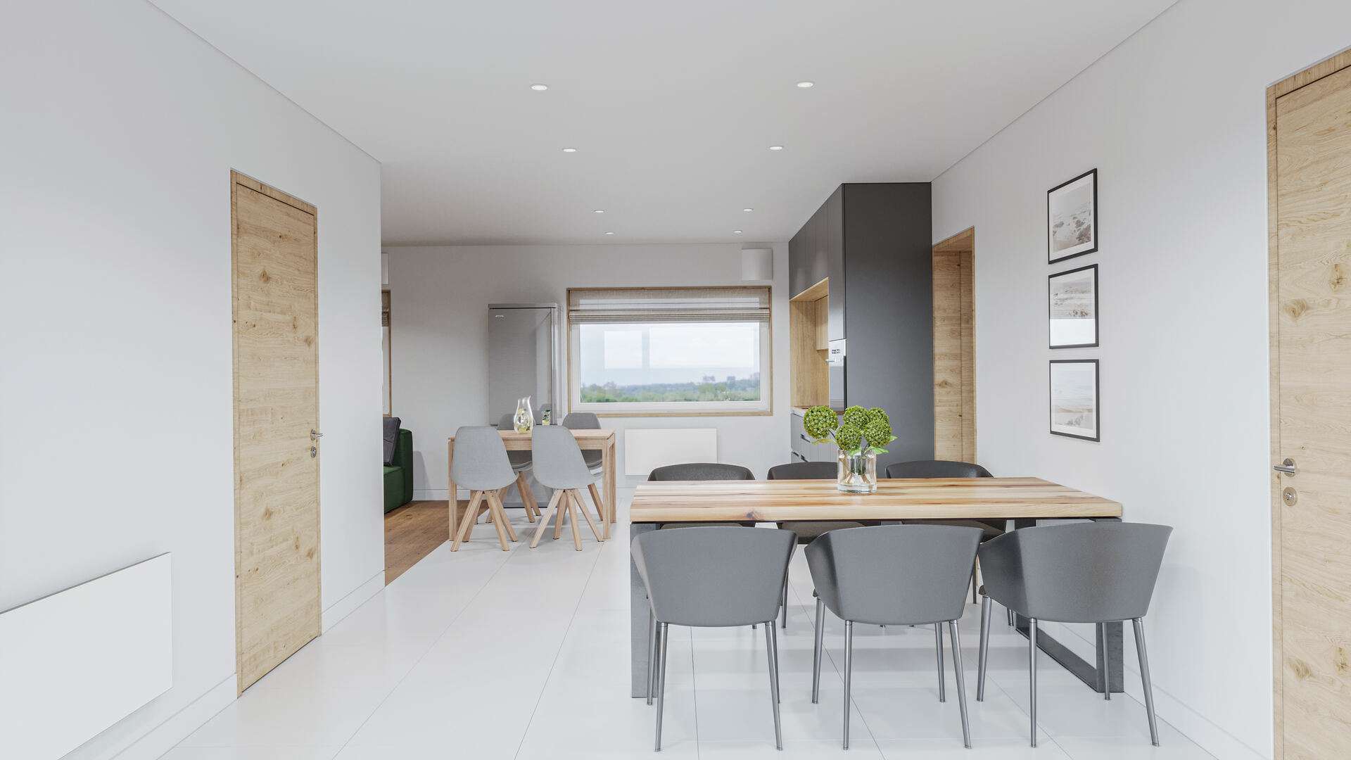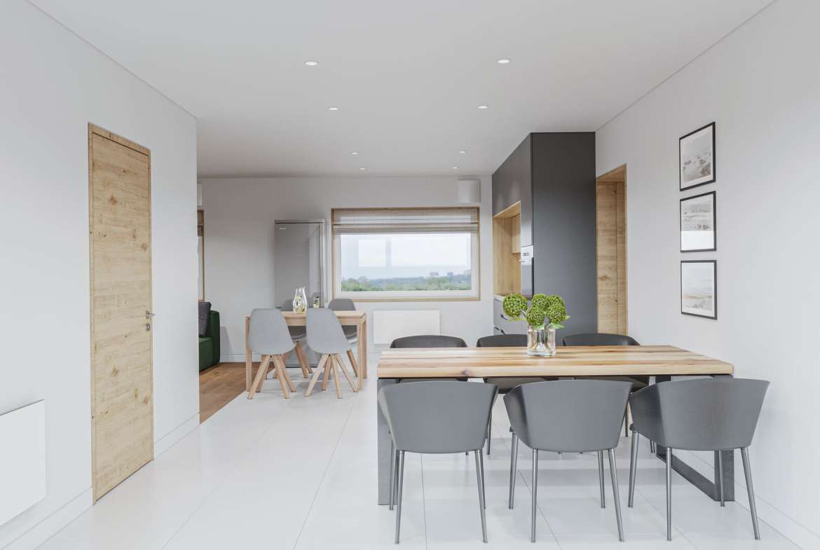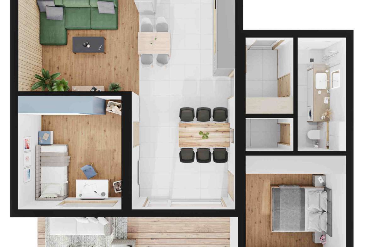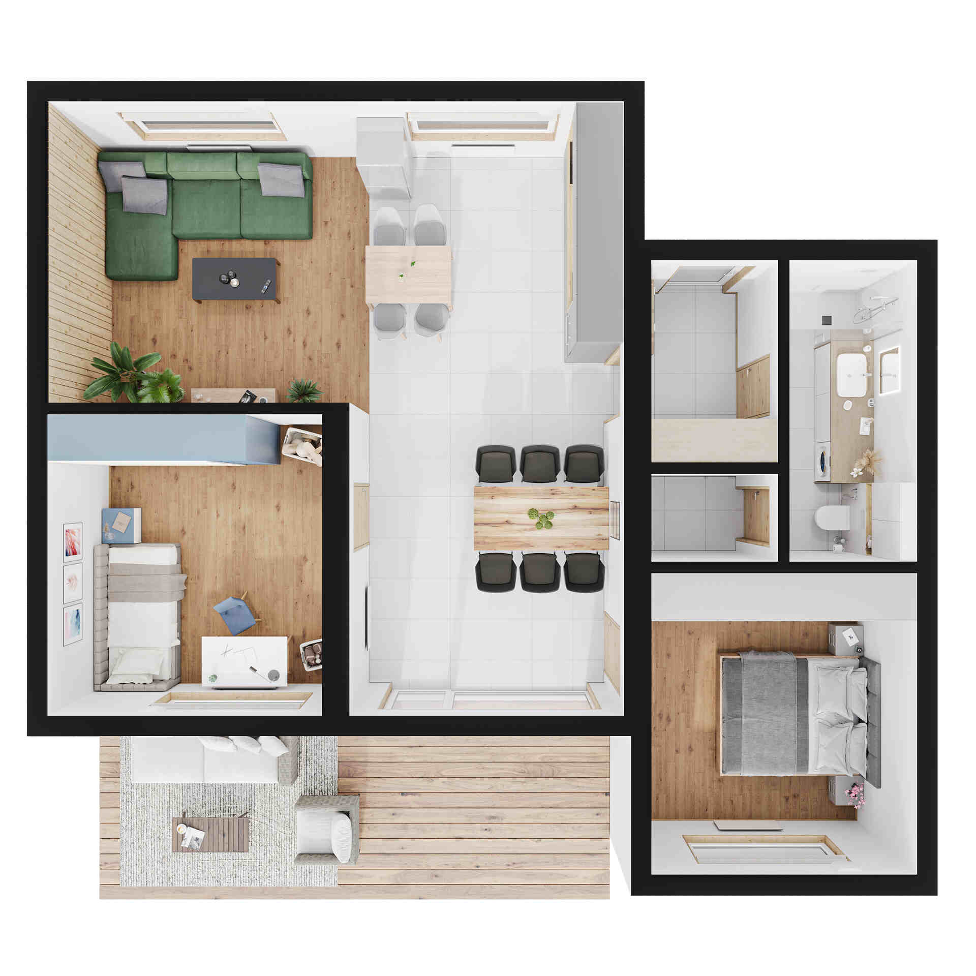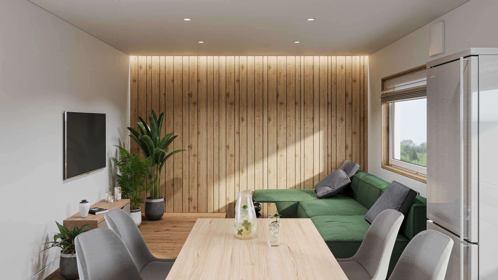 TRIOMOD 94 V2 ist ein modulares Haus von NOVA TEQ, einem Hersteller von Fertighäusern mit Sitz in der Ukraine. Dieses Modulhaus bietet 77 m² Wohnfläche, zwei Schlafzimmer und ein Badezimmer.