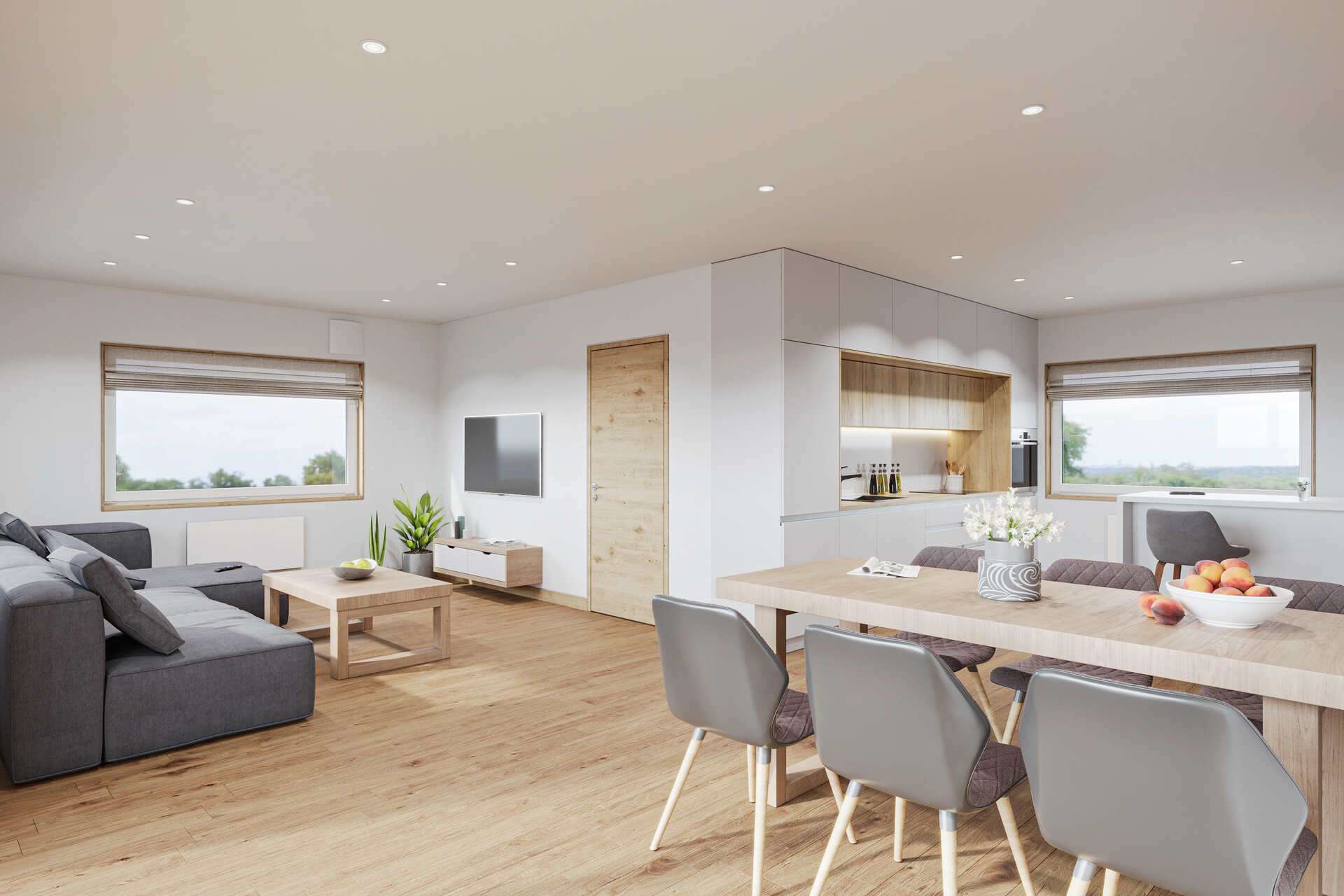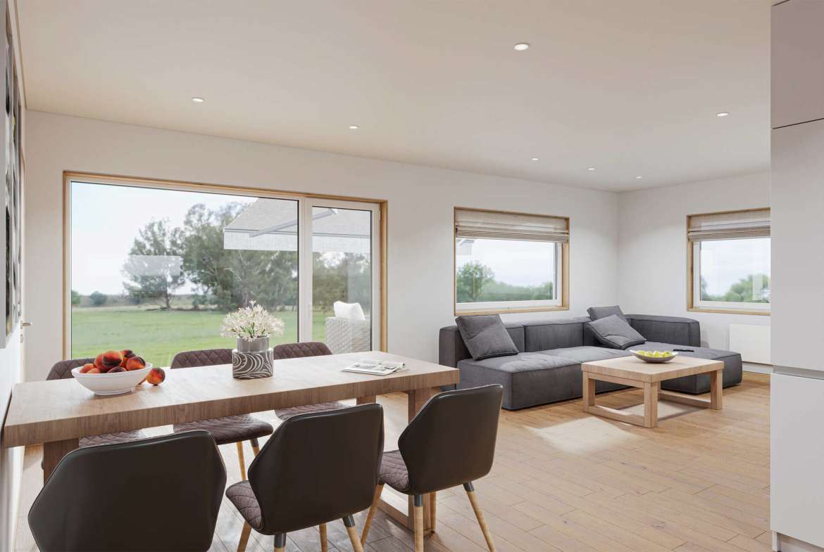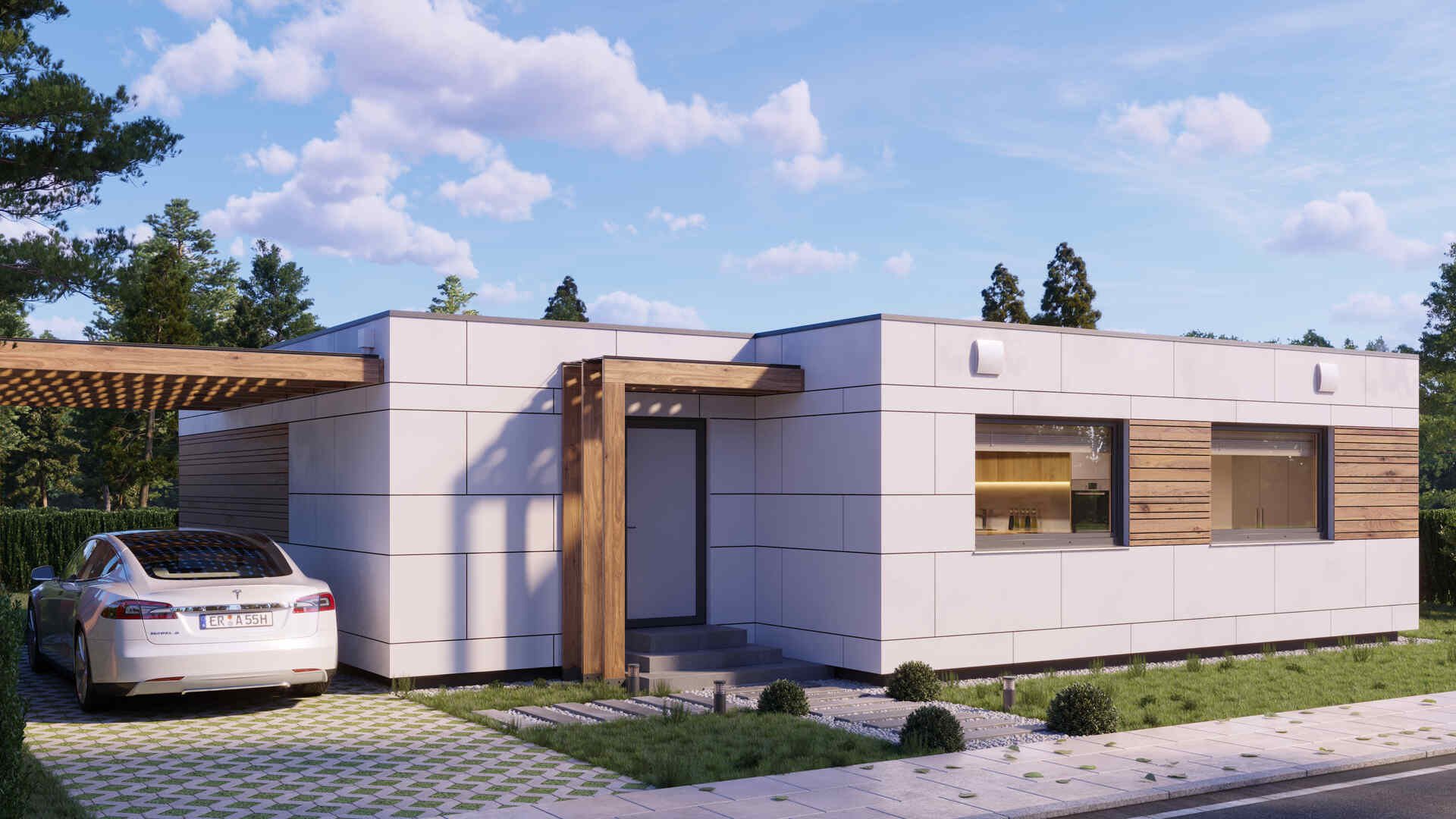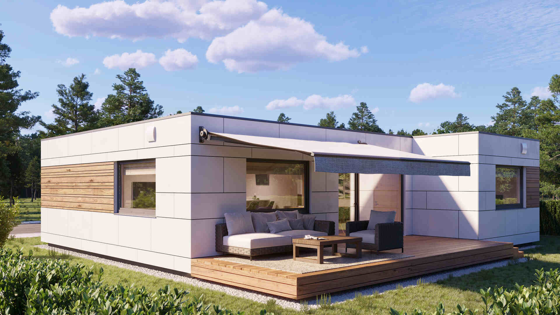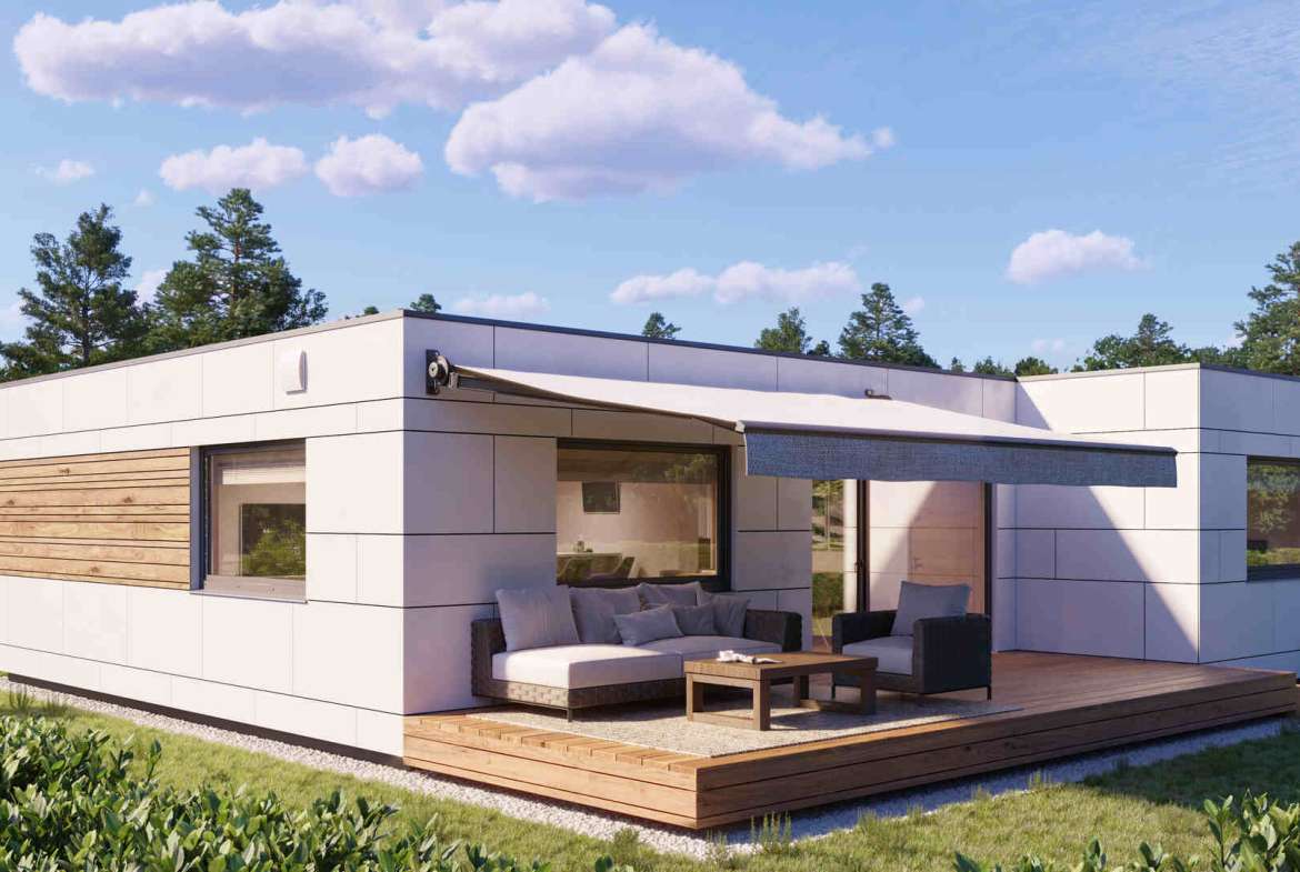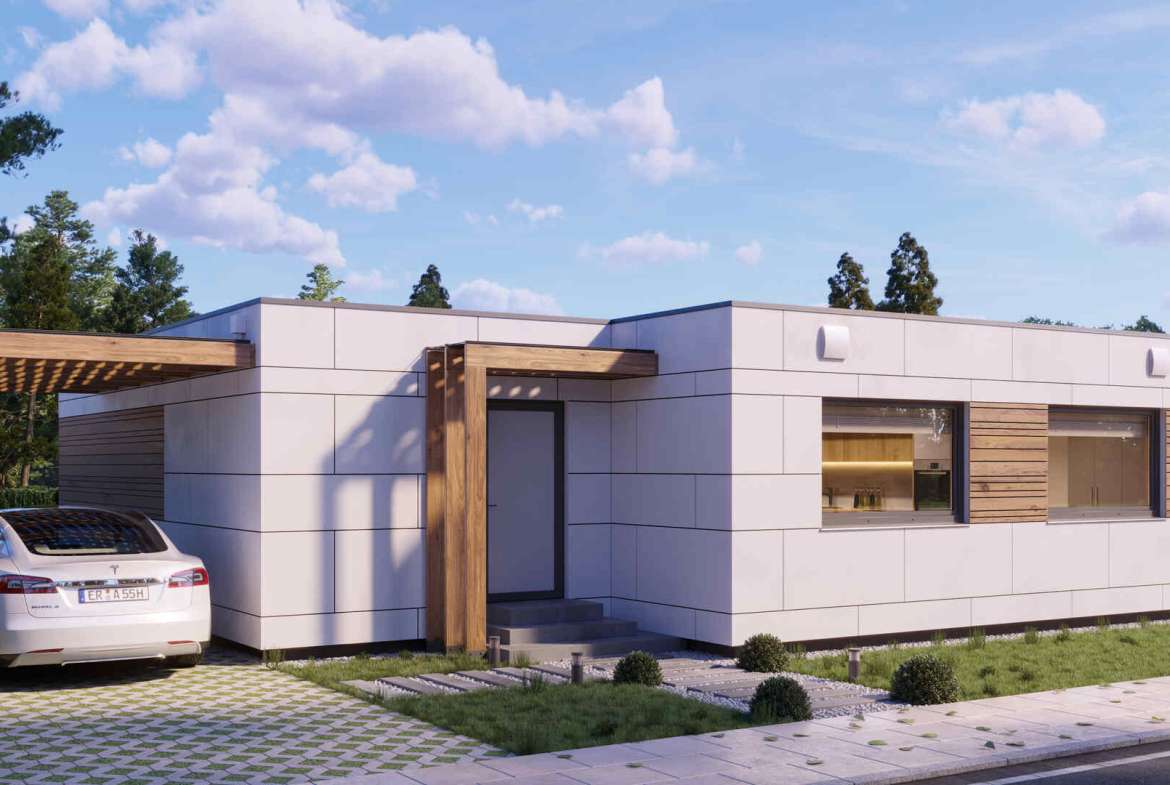 TRIOMOD 94 V3 ist ein modulares Haus von NOVA TEQ, einem Hersteller von Fertighäusern mit Sitz in der Ukraine. Dieses Modulhaus bietet 77 m² Wohnfläche, zwei Schlafzimmer und ein Badezimmer.