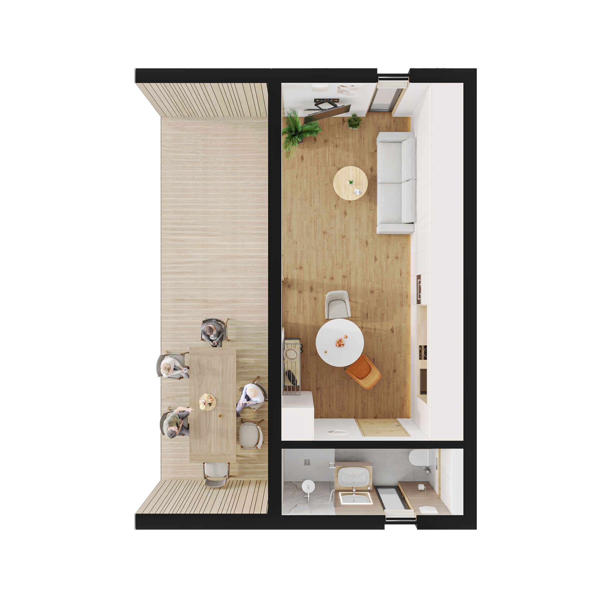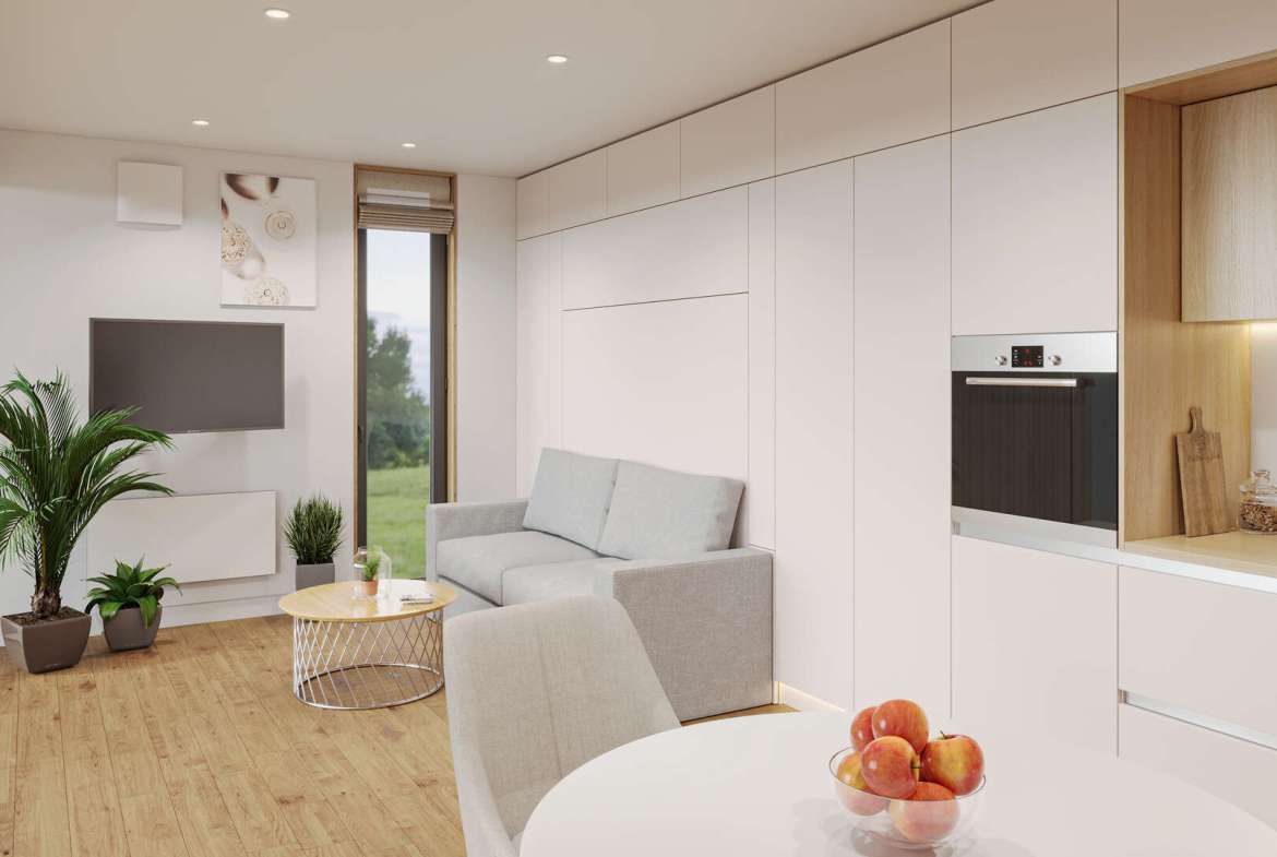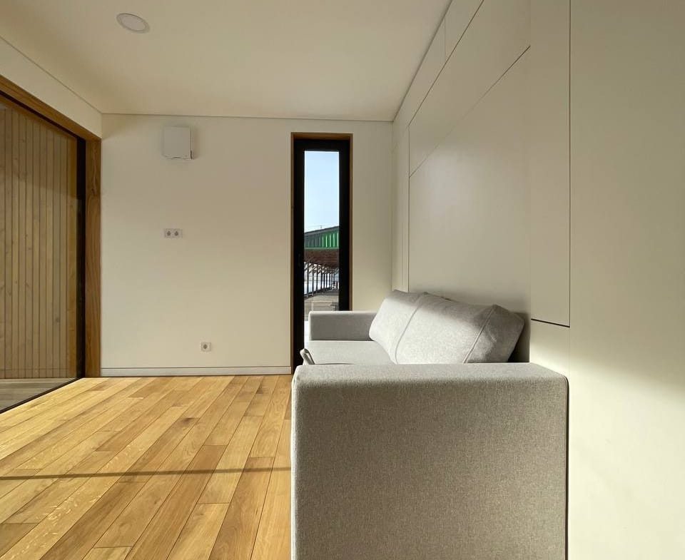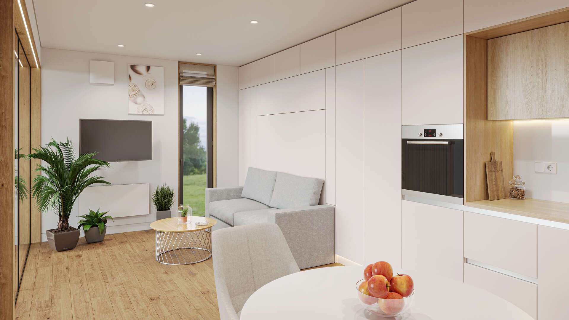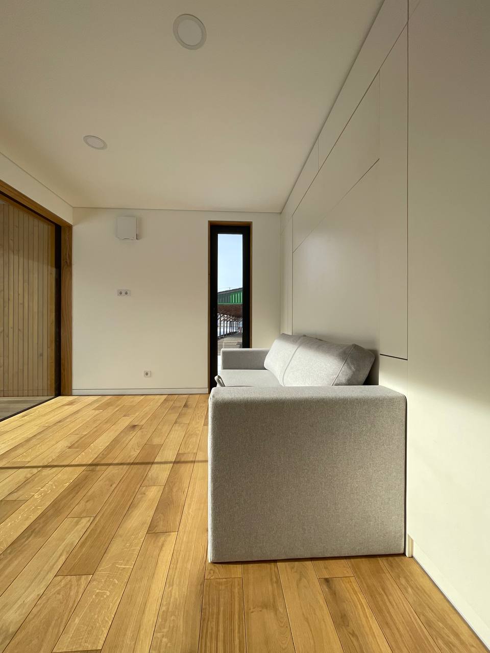 UNOMOD 55 ist ein modulares Haus von NOVA TEQ, einem Hersteller von Fertighäusern mit Sitz in der Ukraine. Dieses Modulhaus bietet 46 m² Wohnfläche, die Platz für 2 Personen bietet.