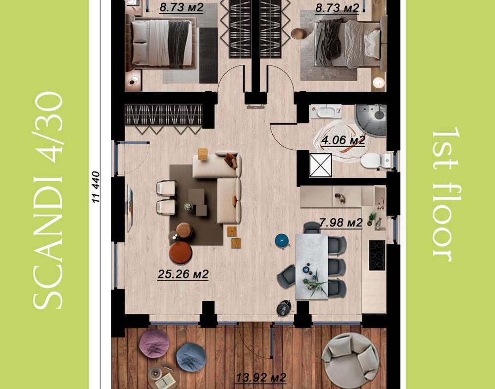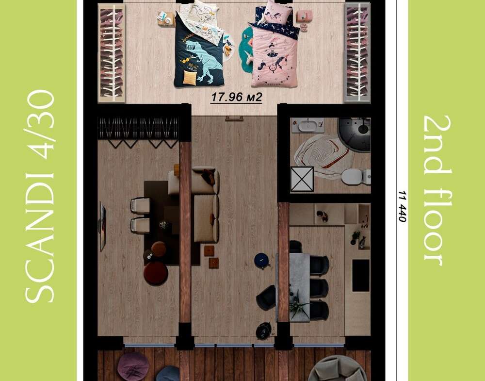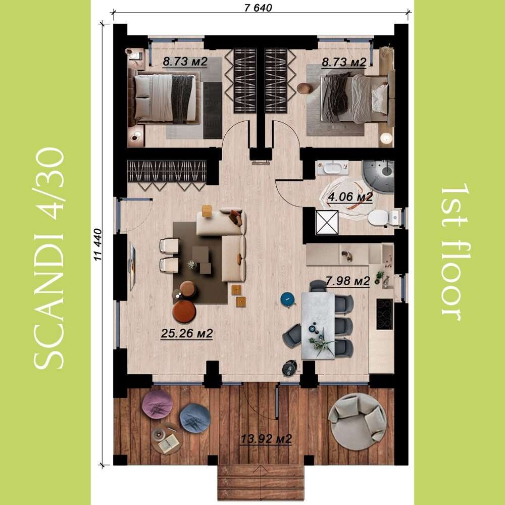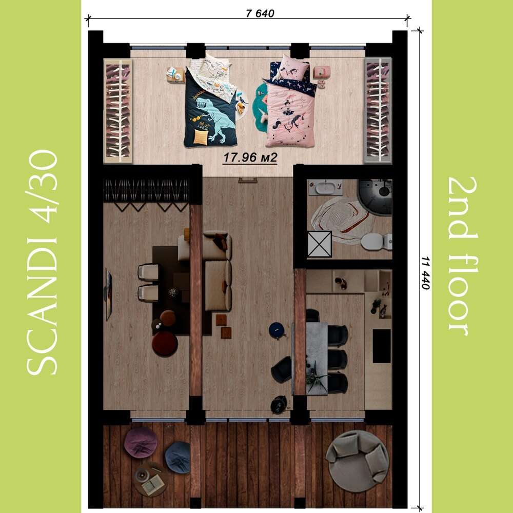 Scandi 4/30 ist ein Modulhaus von Scandi, einem Hersteller von Fertighäusern mit Sitz in Deutschland. Dieses Modulhaus bietet 100 m² Wohnfläche, mit 2 Schlafzimmern und 1 Badezimmer.