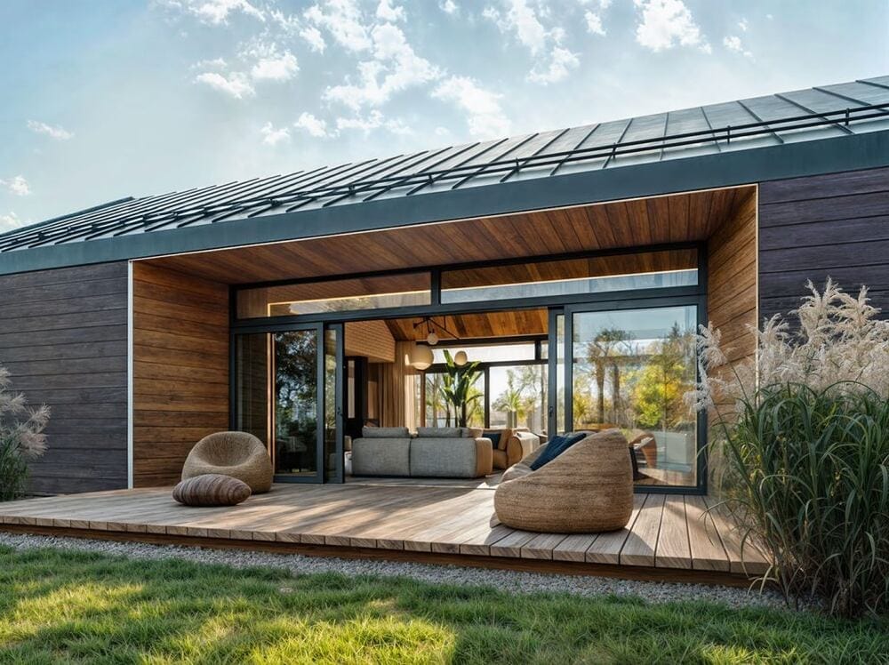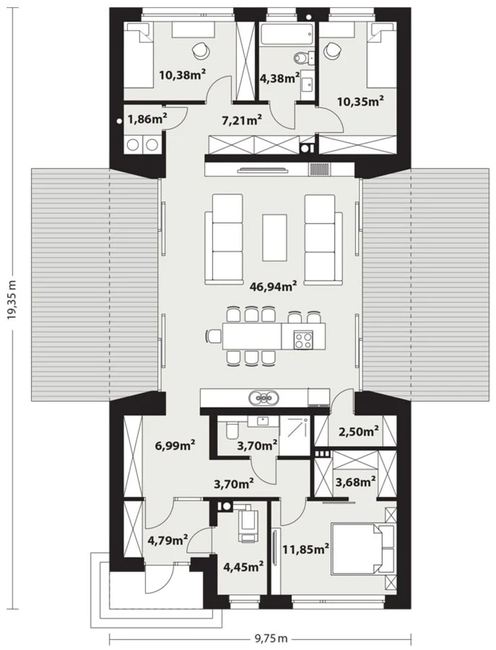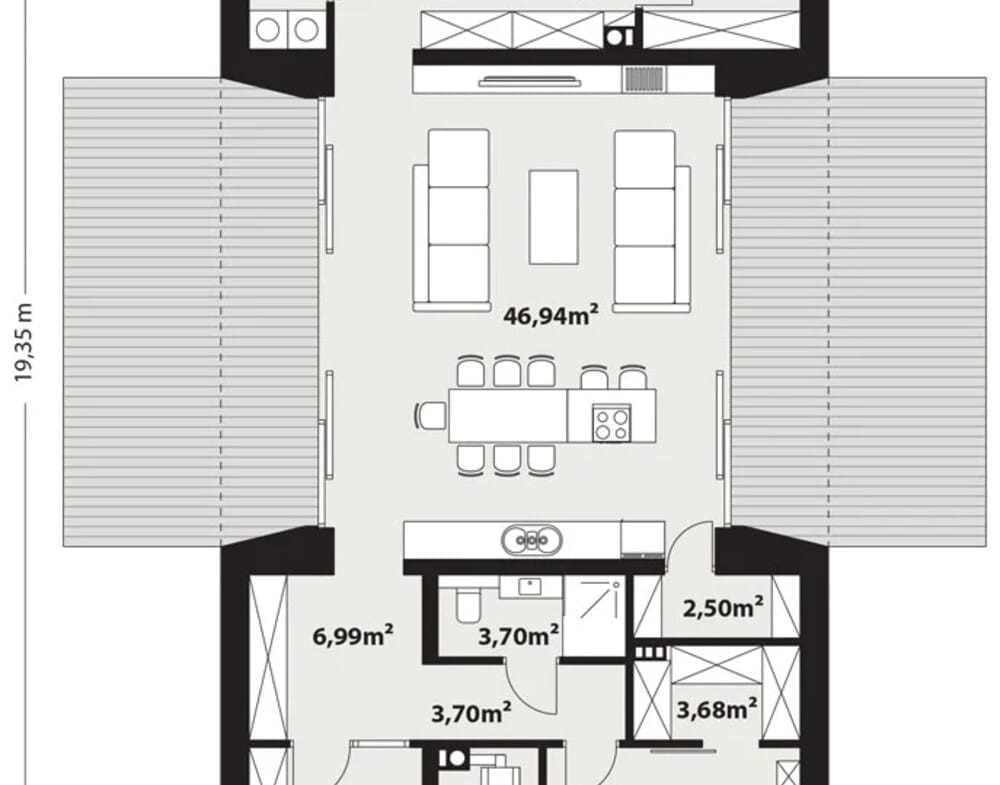 Leon es una casa prefabricada construida por Domki Marysia, un fabricante de prefabricados con sede en Polonia. Esta casa prefabricada ofrece 122,8 m2 de espacio habitable, con 3 dormitorios y 2 cuartos de baño.