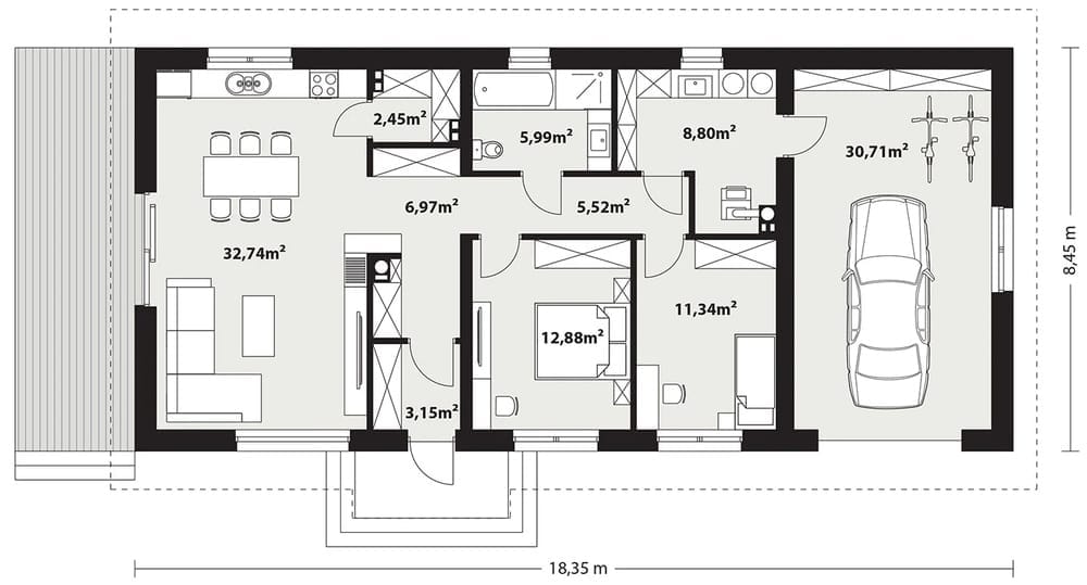 Neo es una casa prefabricada construida por Domki Marysia, un fabricante de prefabricados con sede en Polonia. Esta casa prefabricada ofrece 89m2 de espacio habitable, con 2 dormitorios y 1 baño.