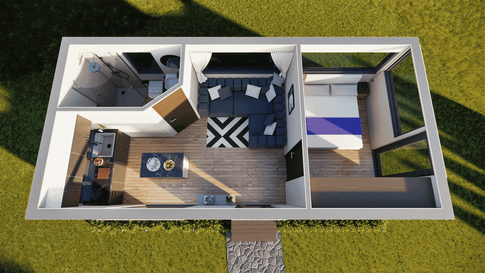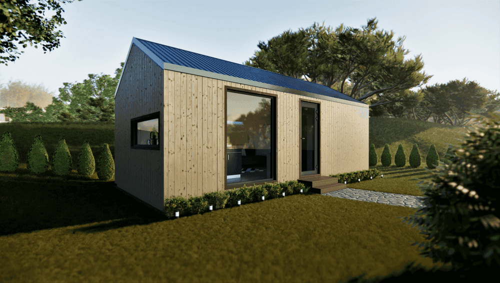 Esta casa prefabricada ofrece 24 m² de espacio habitable, con 1 dormitorio y 1 baño.