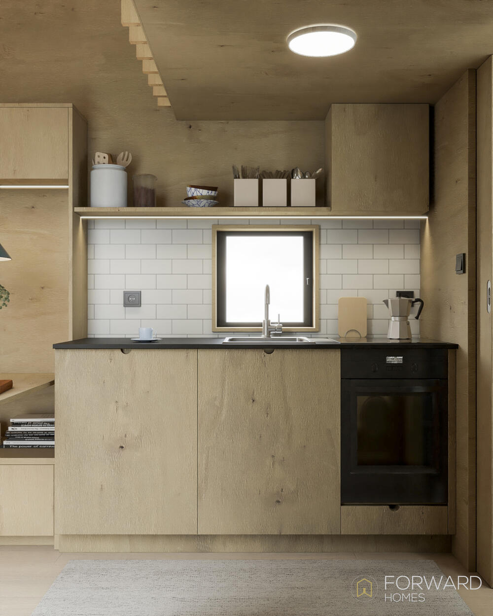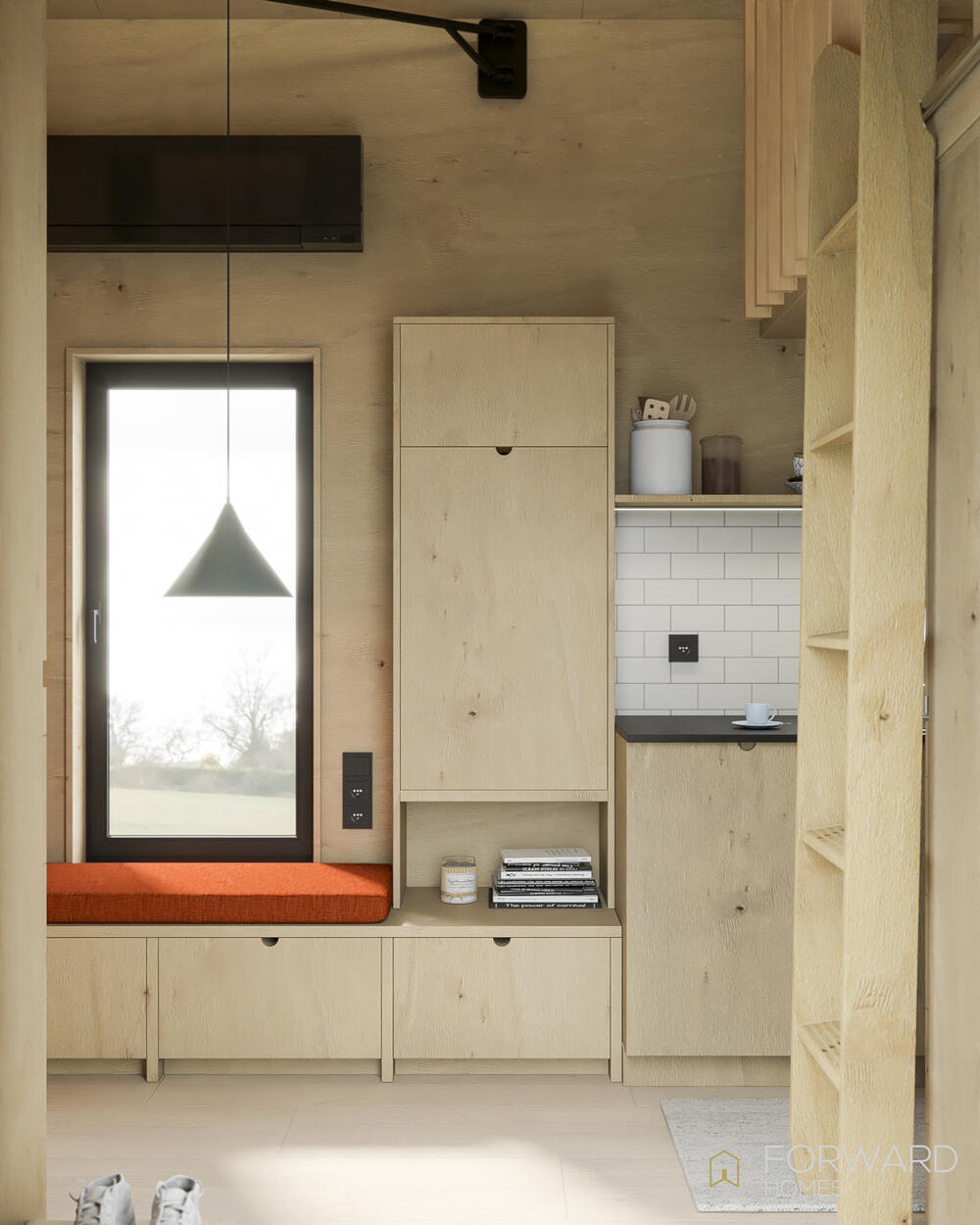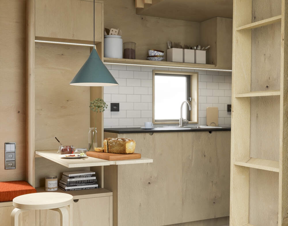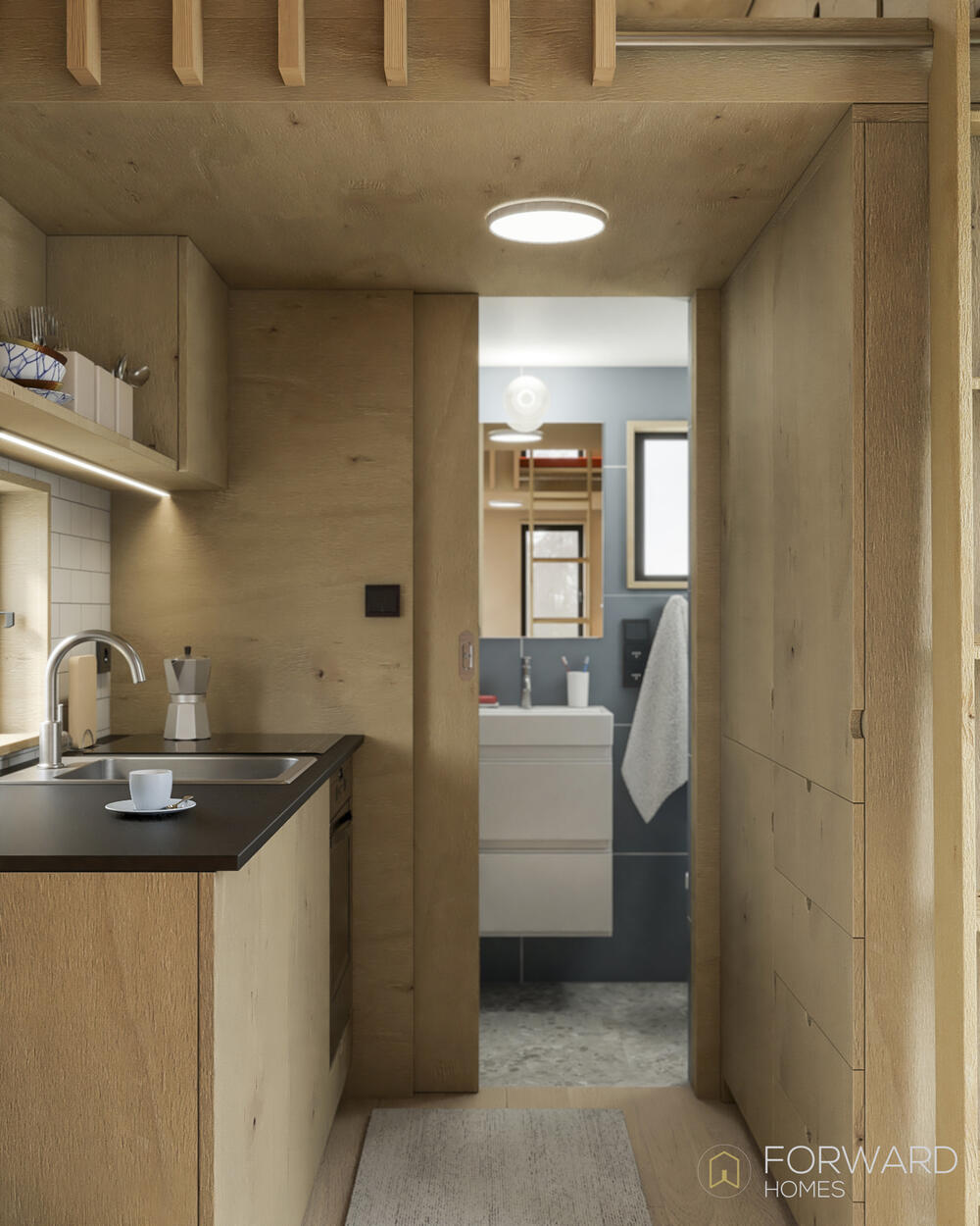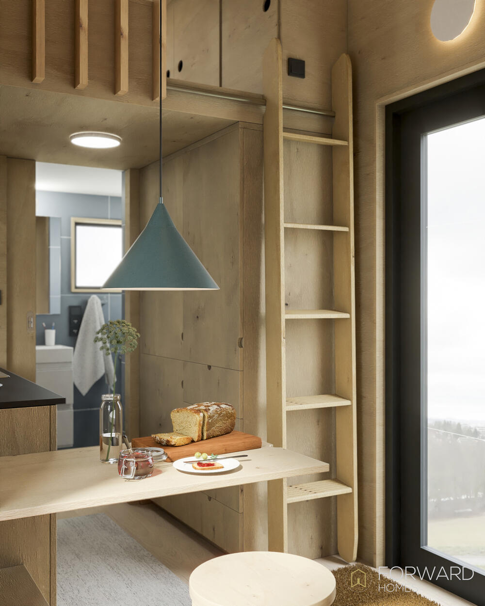 Ty es una casa diminuta construida por Forward Homes, un fabricante de casas prefabricadas con sede en Polonia. Esta casa prefabricada ofrece 17,6 m² de espacio habitable, con capacidad para 5 personas.