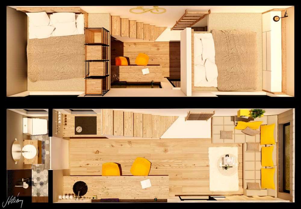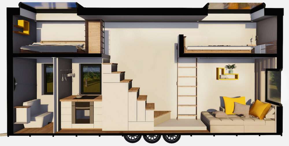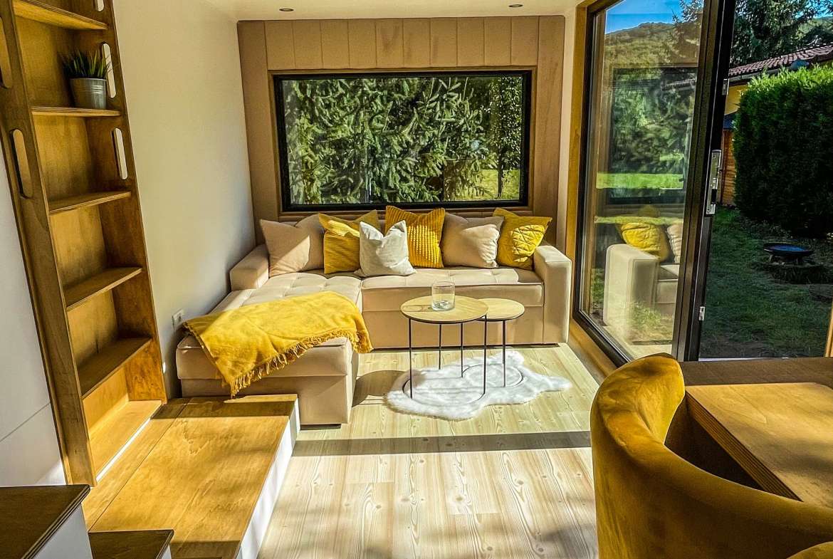 ¡Equipamos cada una de nuestras Tiny house con espacio de almacenamiento adecuado para una Tiny house de vacaciones! Construimos cajones de almacenaje bajo la escalera, el sofá e incluso bajo la cama.