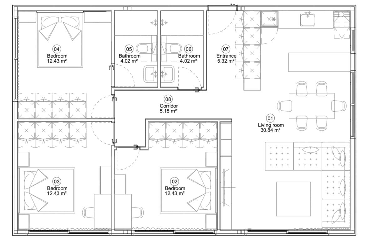 Trio es una casa modular construida por We Modular, un Fabricante de prefabricados con sede en Bulgaria. Esta casa prefabricada ofrece 96 m² de espacio habitable, con 3 dormitorios y 2 baños.