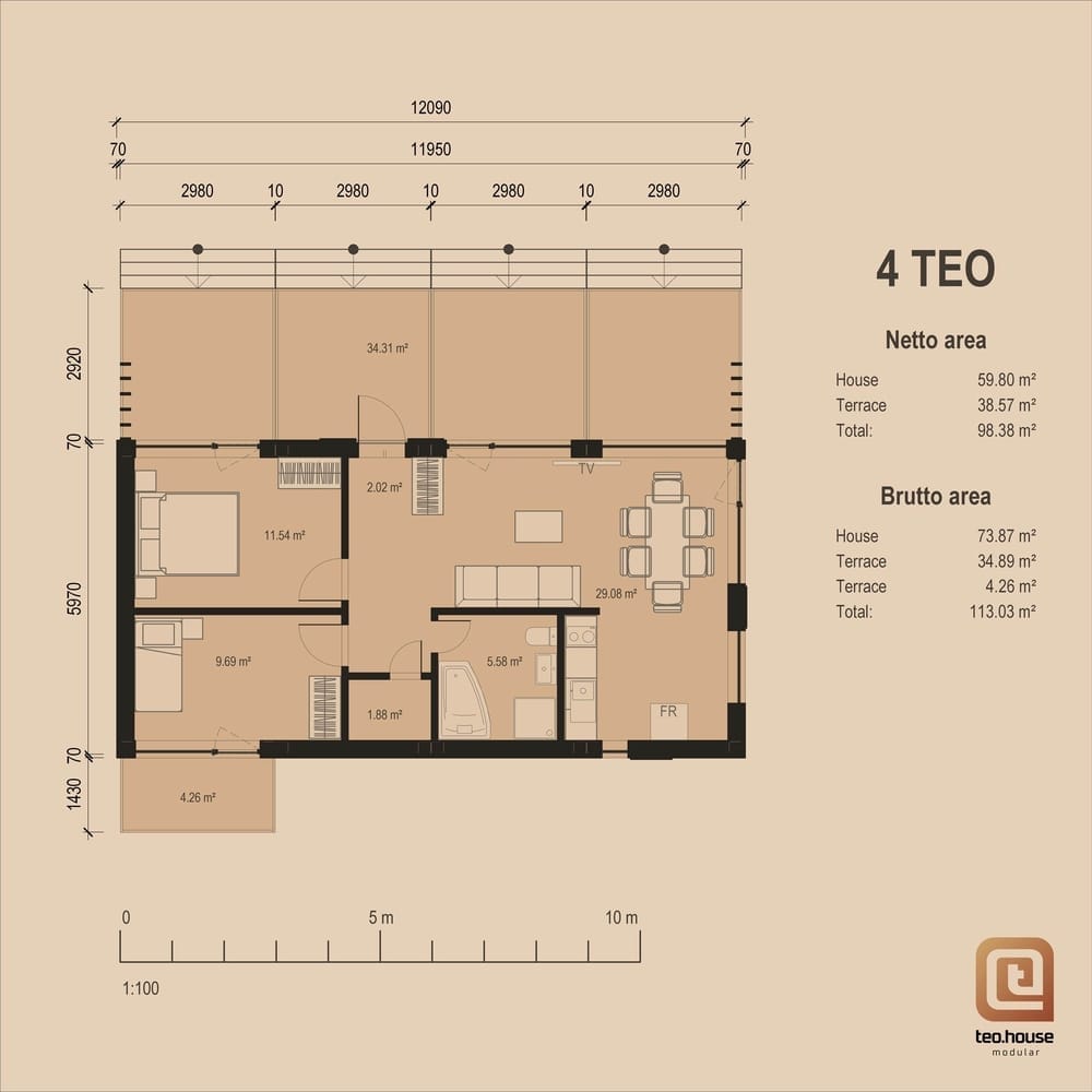 4 Teo est une maison préfabriquée construite par CompactLiving, un Fabricant de préfabriqués basé en Estonie. Cette maison préfabriquée offre 74 m² d’espace habitable avec 2 chambres et 1 salle de bain.