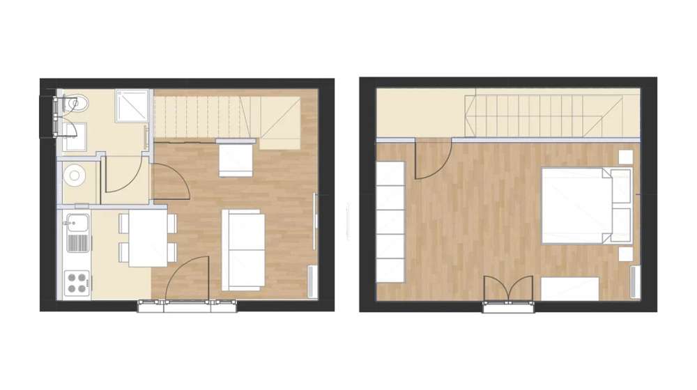 Model C – Cabin is a modular house built by A-FOLD, a prefab manufacturer based in Italy. This modular house provides 59 m² of living space over two floors, with one bedroom and one bathroom.