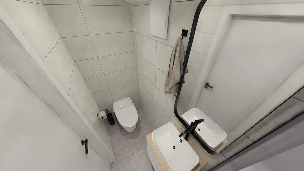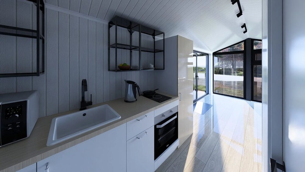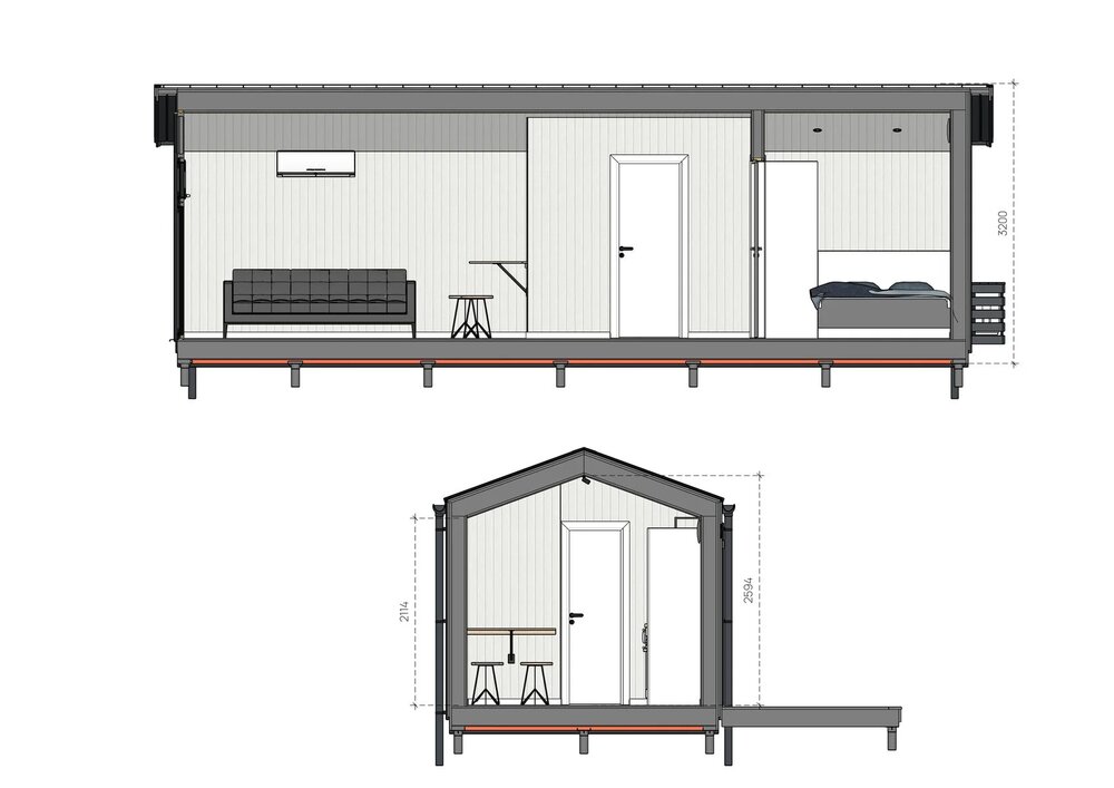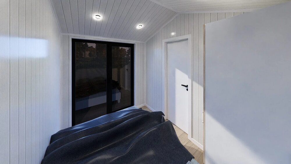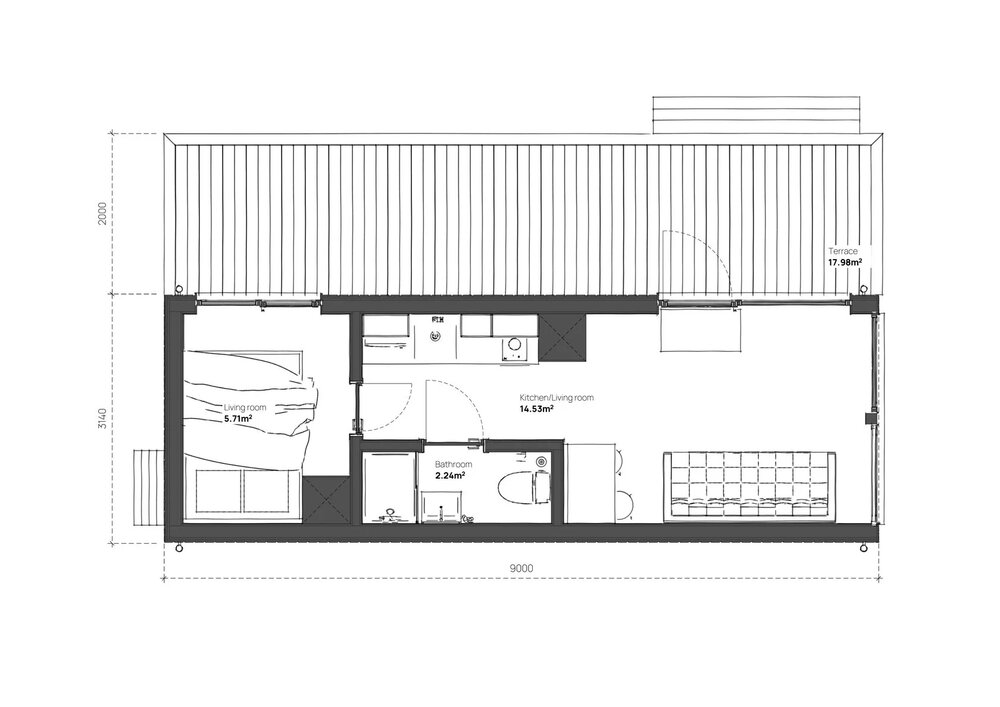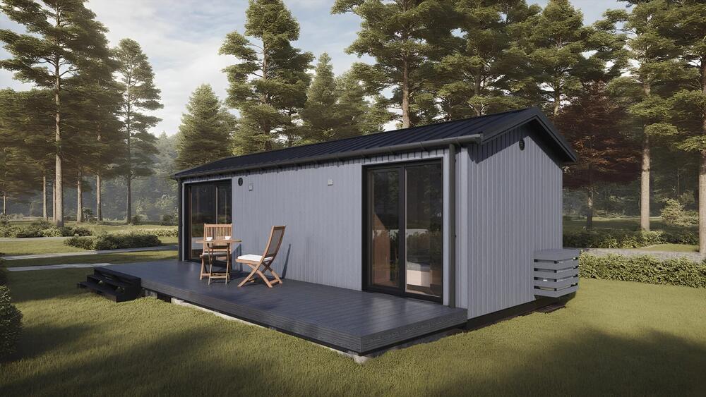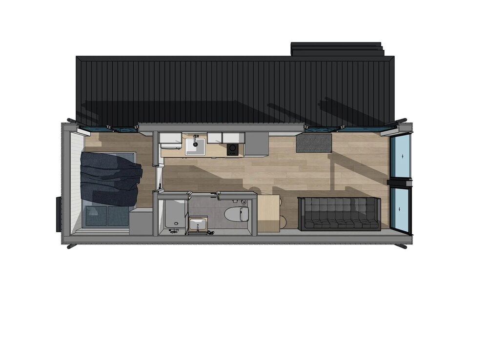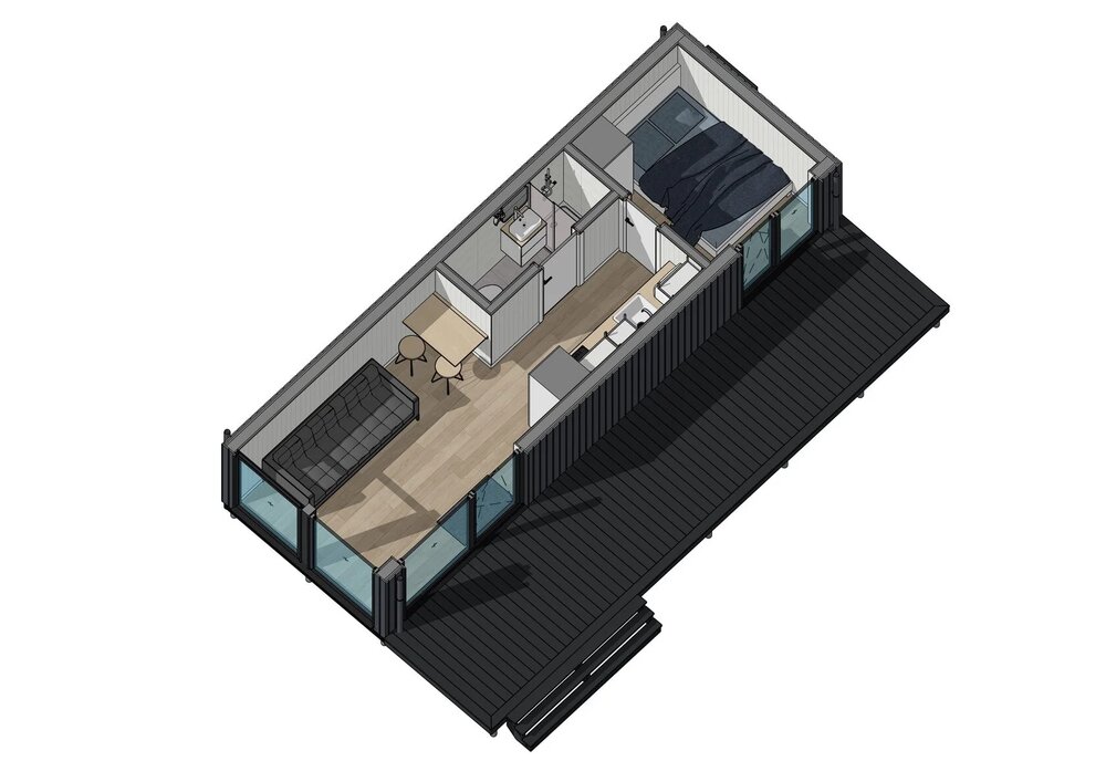 This prefab house provides 30 m² of living space, with 1 bedroom and 1 bathroom.