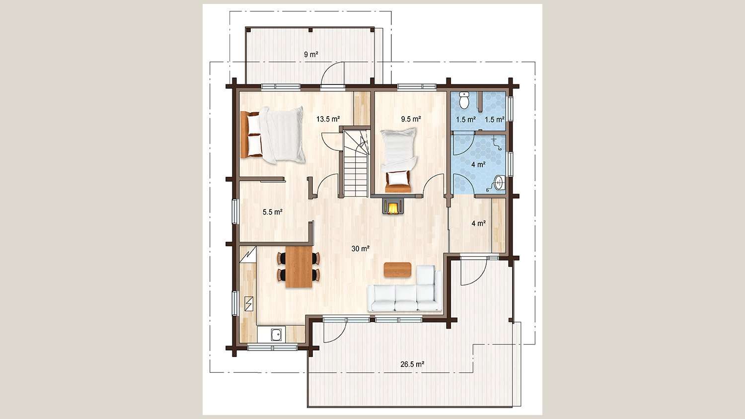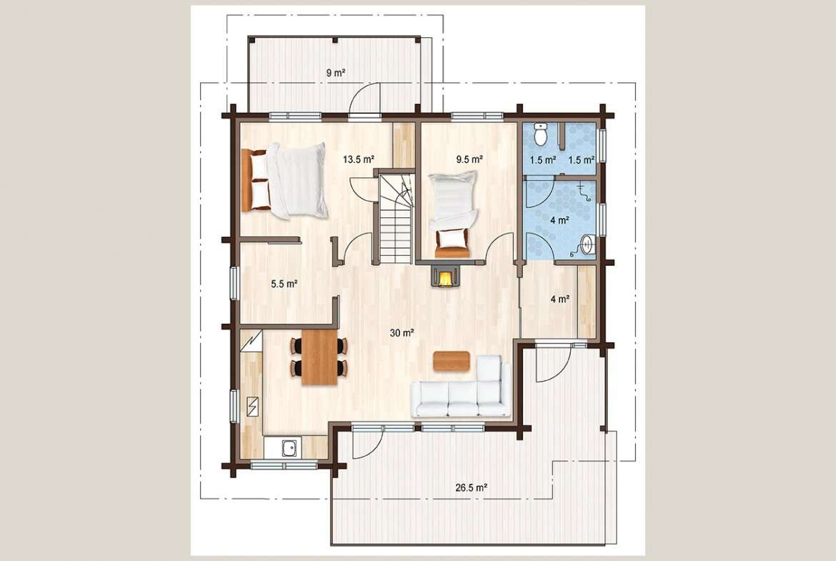 Tepsa is a log house built by Aito Lapland, a house manufacturer based in Finland. This log house has two bedrooms and provides 75 m² of living space over two floors.