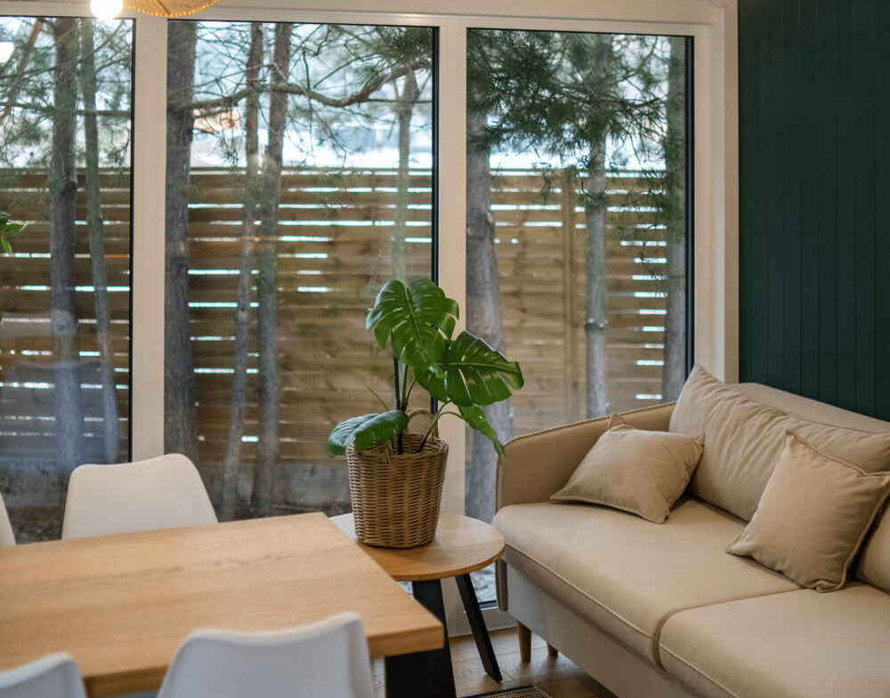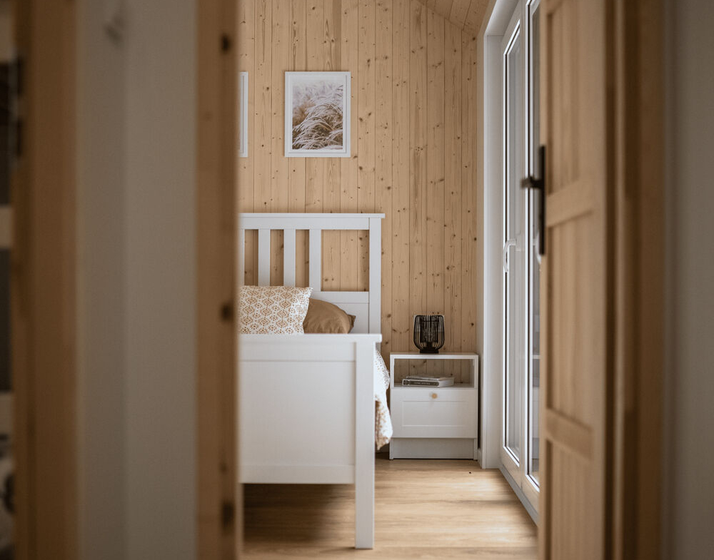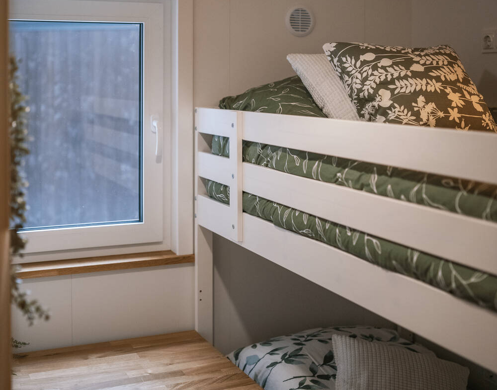 Sky is a modern barn-style house measuring 11.00 × 3.45 × 4.00 m (length × width × height), designed for comfortable, year-round living for 4 to 6 people. Thanks to its gable roof, thoughtful layout, and large glazing, the interior is not only functional but also bright, spacious, and strongly connected to the surrounding nature. The structure is based on wooden frame construction, set on a solid chassis.