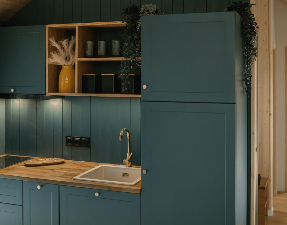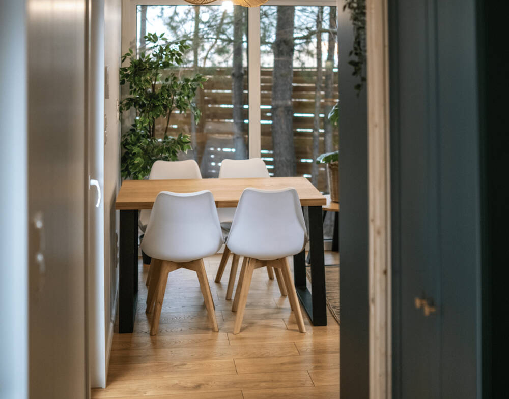 Upon entering, you are welcomed by a functional hallway with a large mirror, a spacious wardrobe, a shoe cabinet with a seat, a coat rack, and a wall shelf. Above the bathroom, there is a luggage mezzanine that offers additional storage space. The heart of the house is a spacious living room with large glazing, a corner sofa with a sleeping function, a coffee table, and a TV. The room is complemented by a straw pendant lamp and a dimmer that allows for mood lighting. The living room flows seamlessly into the kitchen area, which features a full set of cabinetry: a drawer cabinet under the induction cooktop, a sink cabinet, a small cargo pull-out, wall cabinets (including open ones), a built-in range hood, and a medium-sized built-in refrigerator. The living area is completed with a large dining table and four chairs.