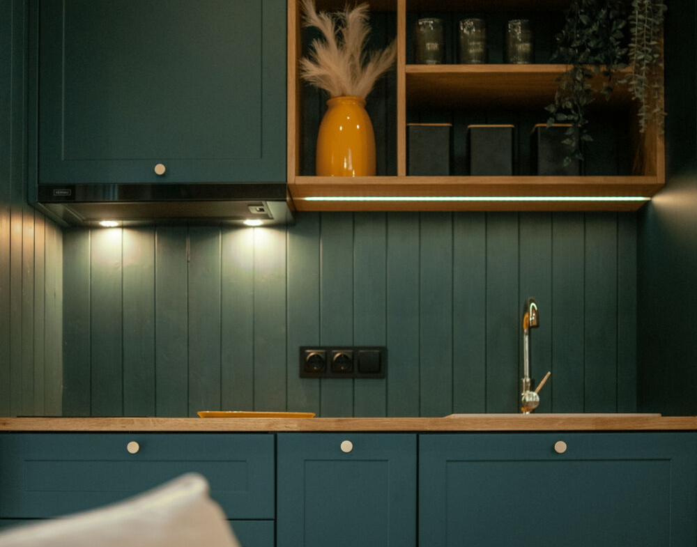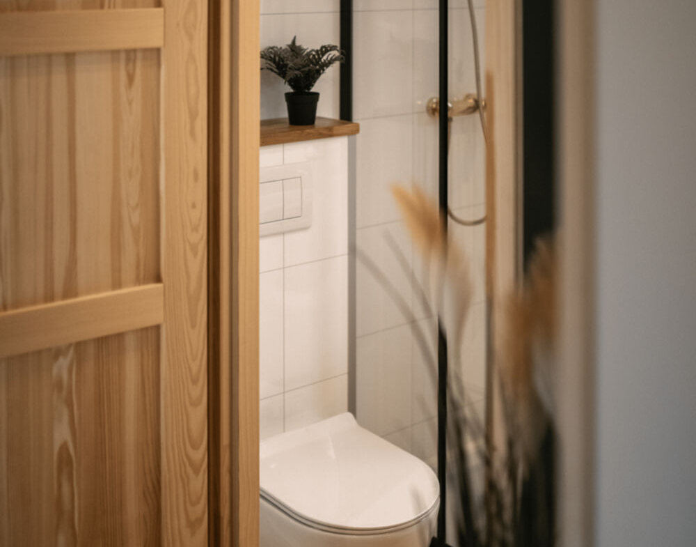 The bathroom has been carefully designed with attention to every detail. It features a glass shower enclosure, a wall-hung toilet (Geberit), a vanity with a sink and sliding doors, a storage cabinet, a countertop with space prepared for a washing machine, a wall cabinet, an illuminated mirror, wooden doors, and Fibo wall panels. Hot water is supplied by a 50 L Ariston electric boiler. All rooms — including the bathroom — are fitted with high-quality flooring panels.