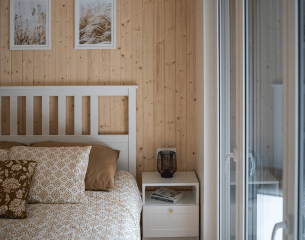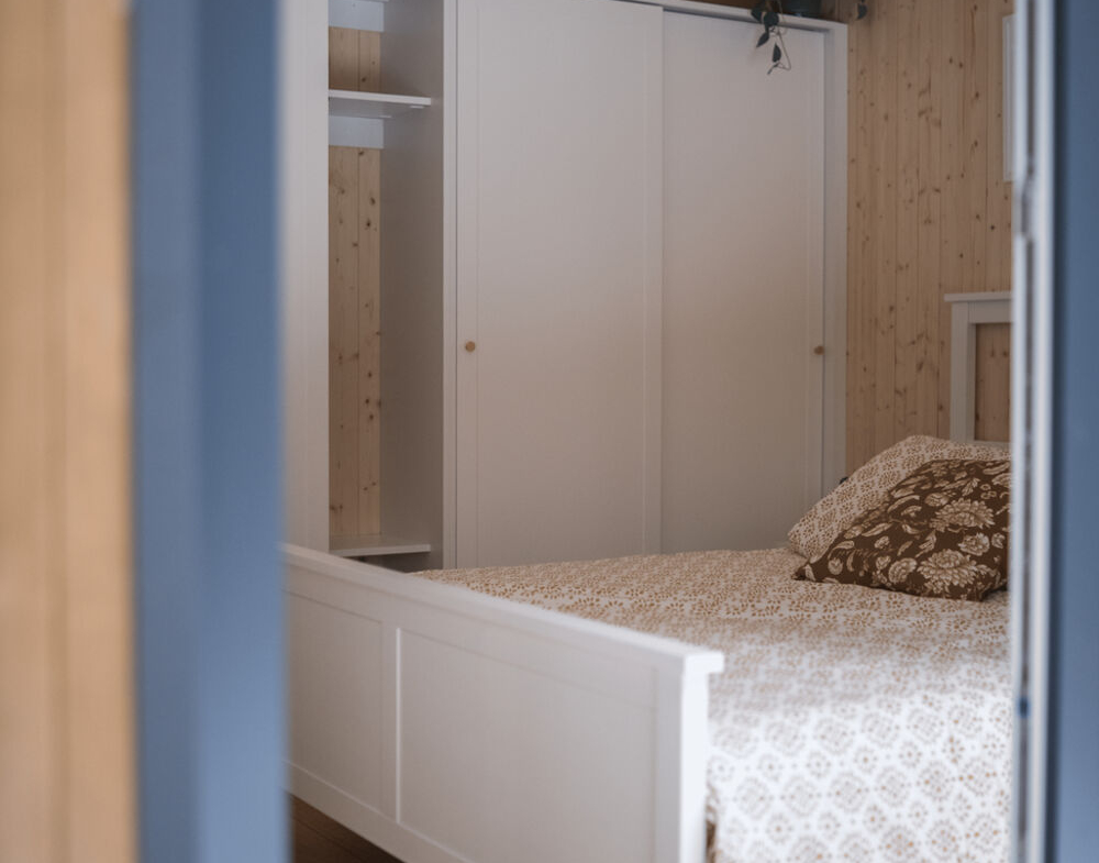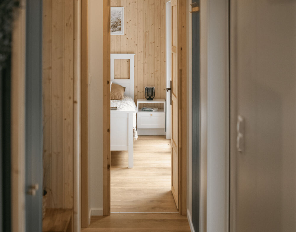 Sky offers two separate bedrooms. The master bedroom includes a 160 × 200 cm bed, two bedside tables, a large wardrobe with sliding doors, a TV, a straw pendant lamp, and decorative posters that add a cozy atmosphere. The second room is designed as an ideal children’s space — with a bunk bed, desk, armchair, and pendant lamp. This room can also be arranged as a guest room or home office.