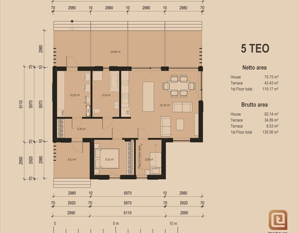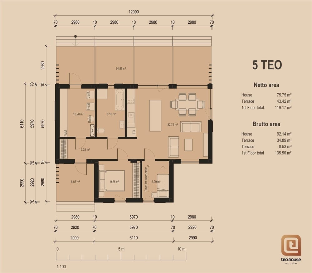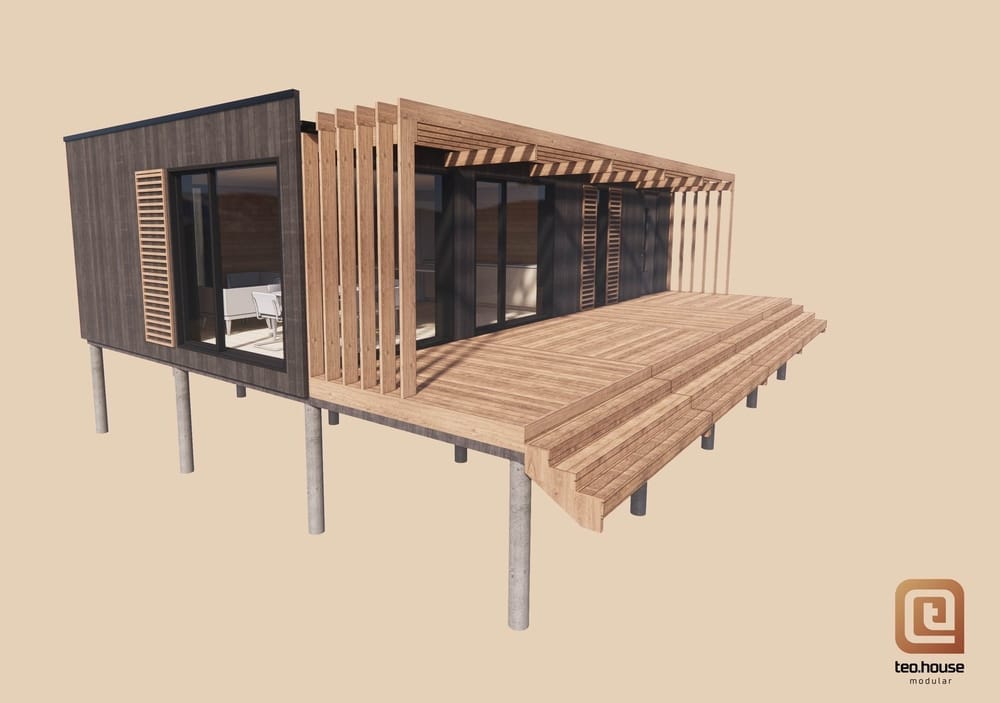 5 Teo is a prefab house built by CompactLiving, a prefab manufacturer based in Estonia. This prefab house provides 92 m² of living space with 2 bedrooms and 1 bathroom.
