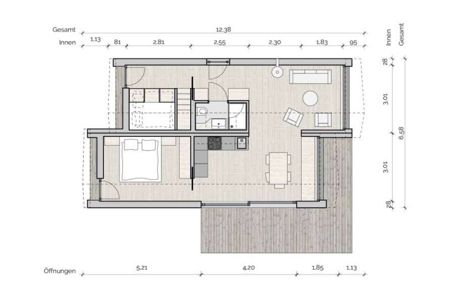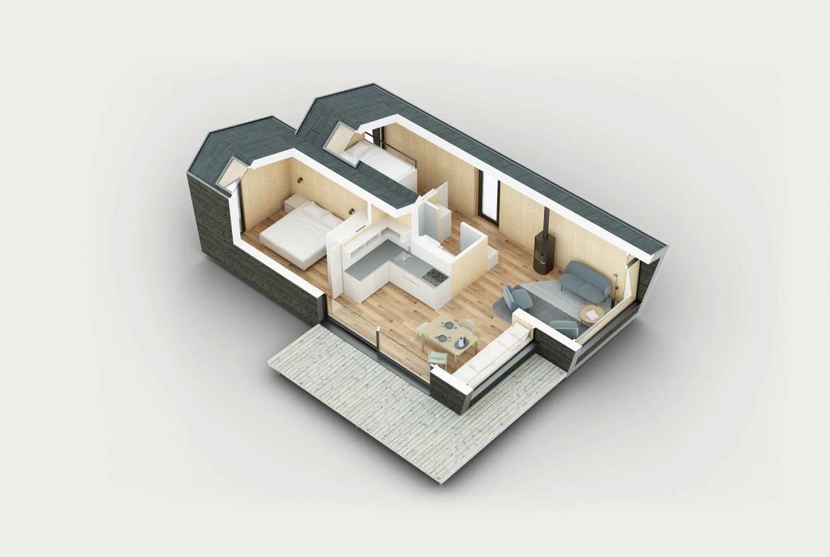 Cabin Suite is a modular house built by Home One, a prefab manufacturer based in Germany. This modular house provides 55 m2 of living space with two bedrooms and one bathroom.