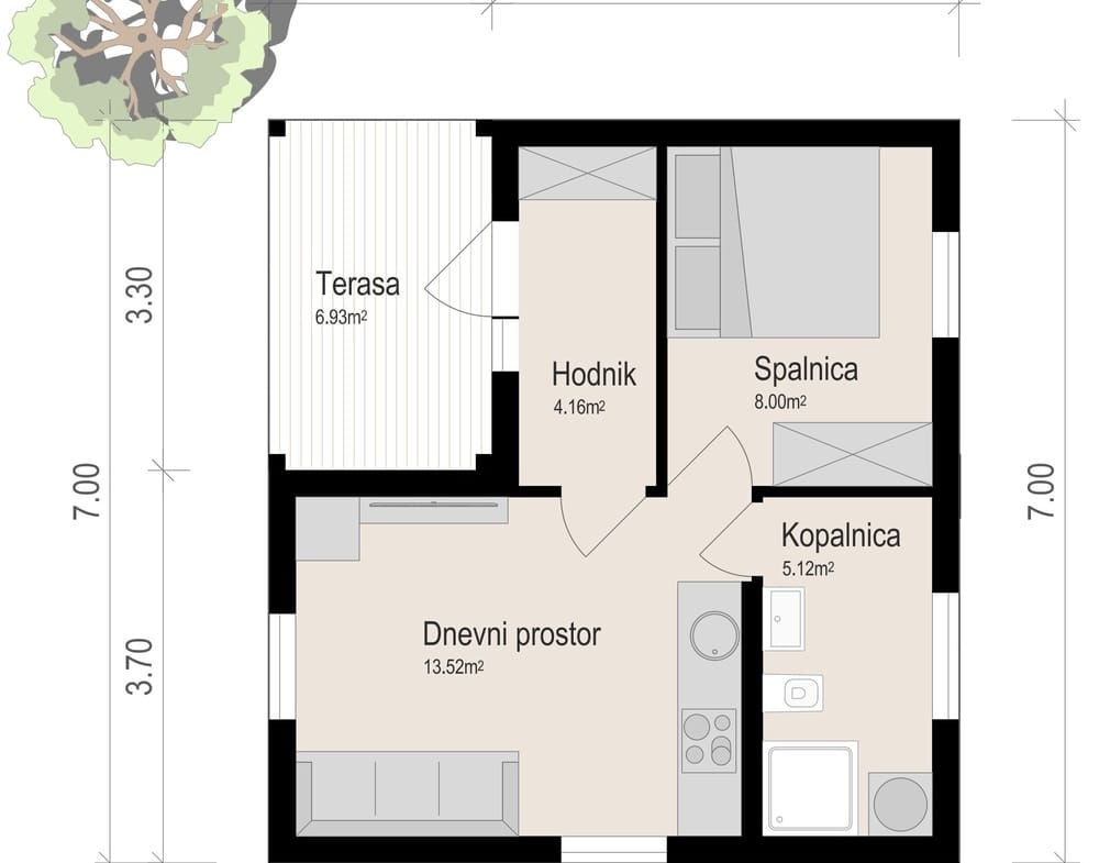 Cubie 39 is a modular home built by Hrovat, a manufacturer based in Slovenia. This prefab house provides 39 m² of living space, with one bedroom and one bathroom.