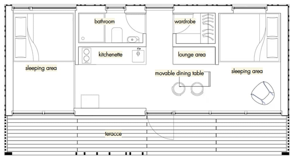 Konga L is a modular cabin built by Konga Cabin, a prefab manufacturer based in Lithuania. This prefab house provides 30 m² of living space, with 2 bedrooms and 1 bathroom.