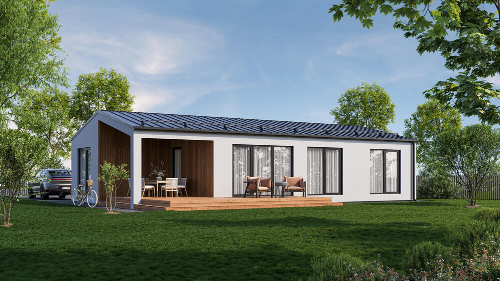 This prefab house provides 80 m² of living space, with 3 bedrooms and 1 bathroom.