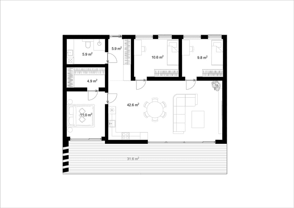 Nord 90 is a prefab house built by Nordroof, a prefab manufacturer based in Lithuania. This prefab house provides 90.7 m² of living space with 3 bedrooms and 1 bathroom.