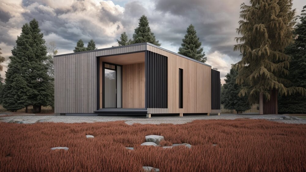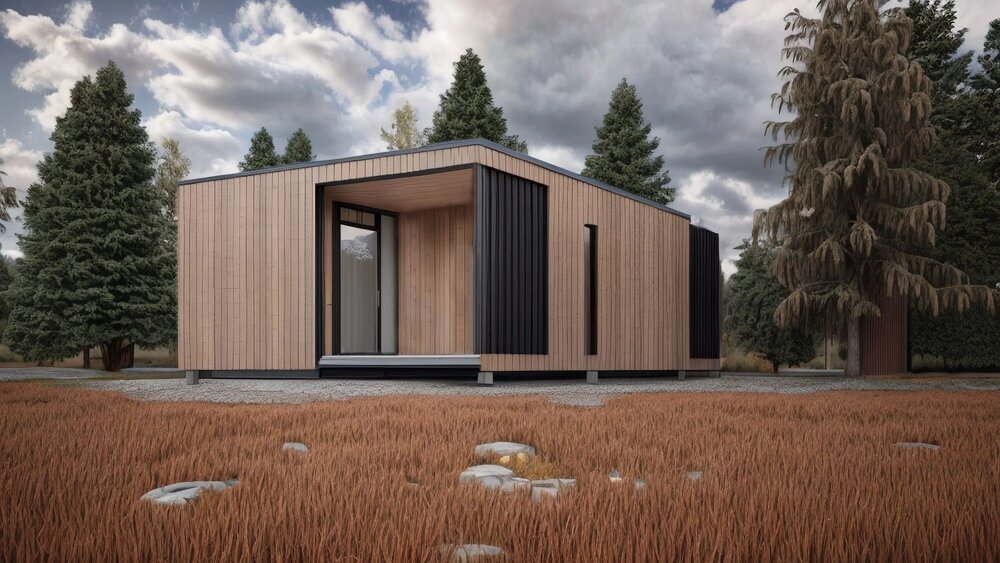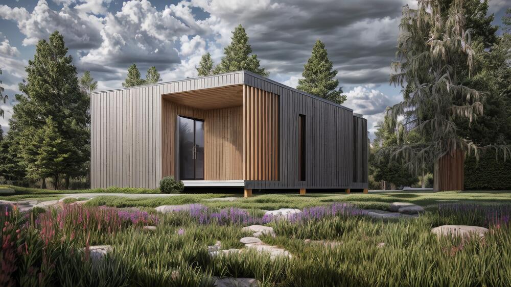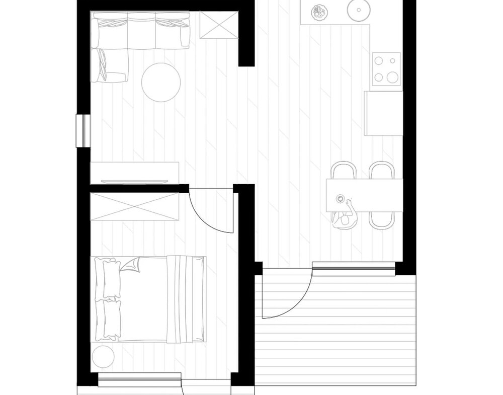 This prefab house provides 43.4 m² of living space, with 1 bedroom and 1 bathroom.