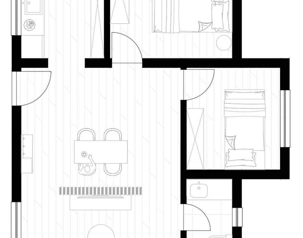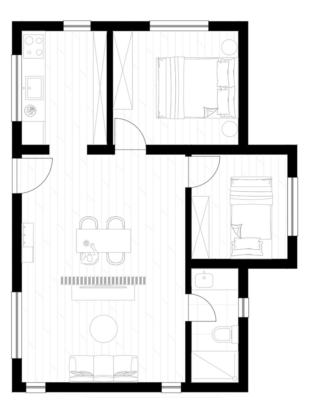 This prefab house provides 60.6 m² of living space, with 2 bedrooms and 1 bathroom.