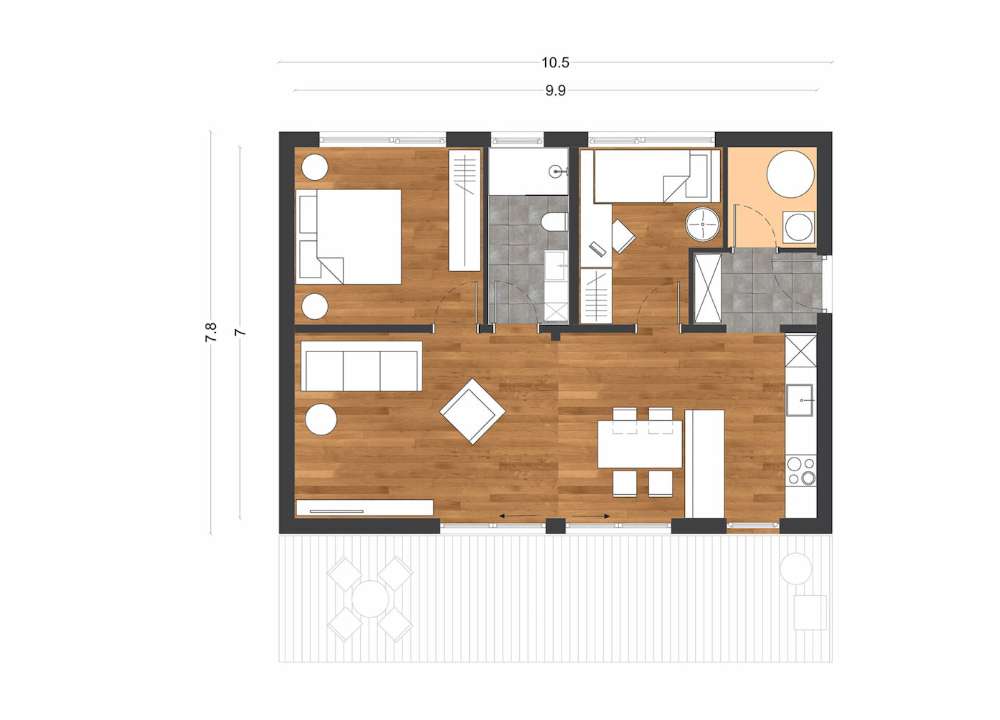 RMB Modul 80 is a modular house built by RMB Modulbau, a prefab manufacturer based in Slovenia. This modular house provides 69.6 m² of living space with two bedrooms and one bathroom.