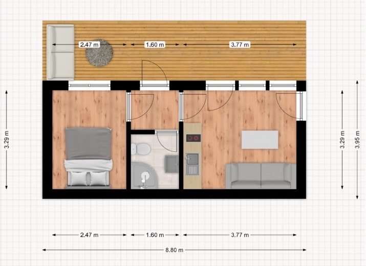 26m² Cabin is a modular house built by Spars AP, a prefab manufacturer based in Latvia. This modular house provides 26 m² of living space with one bedroom and one bathroom.