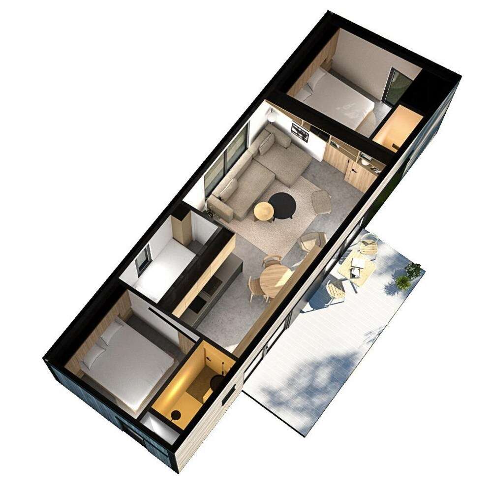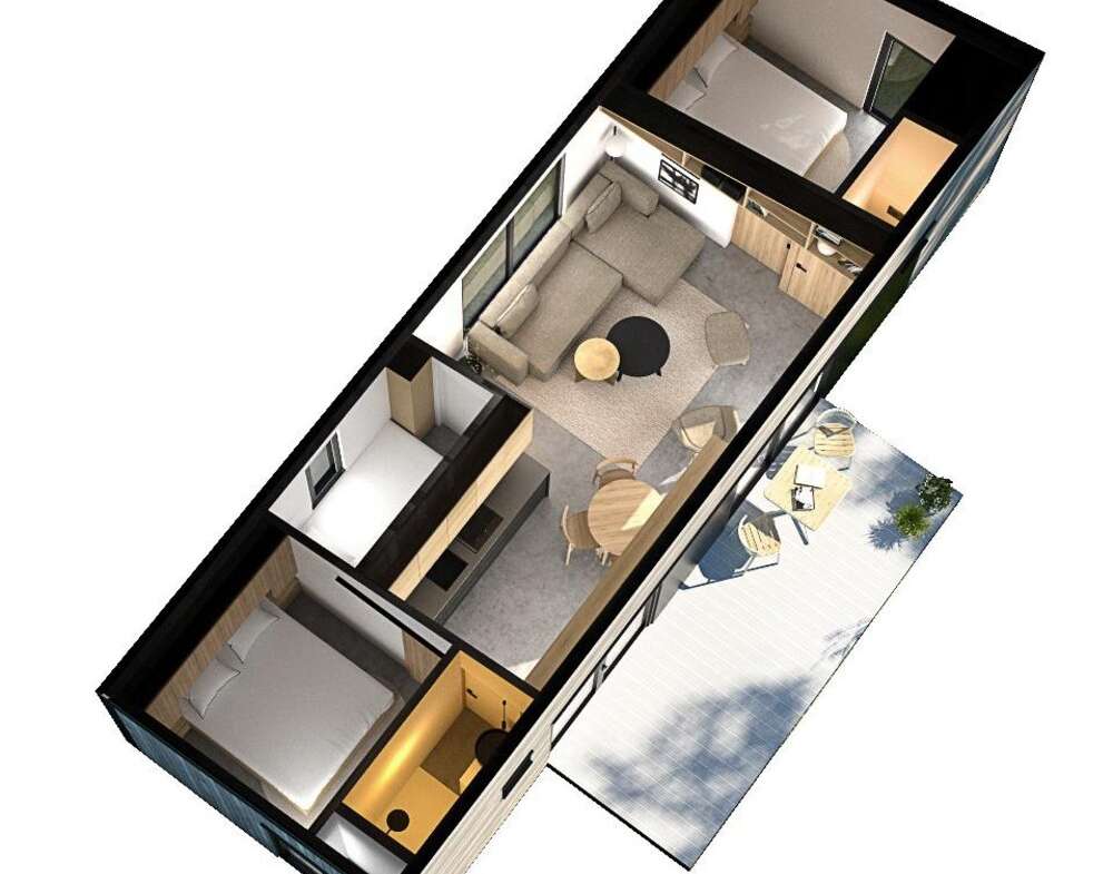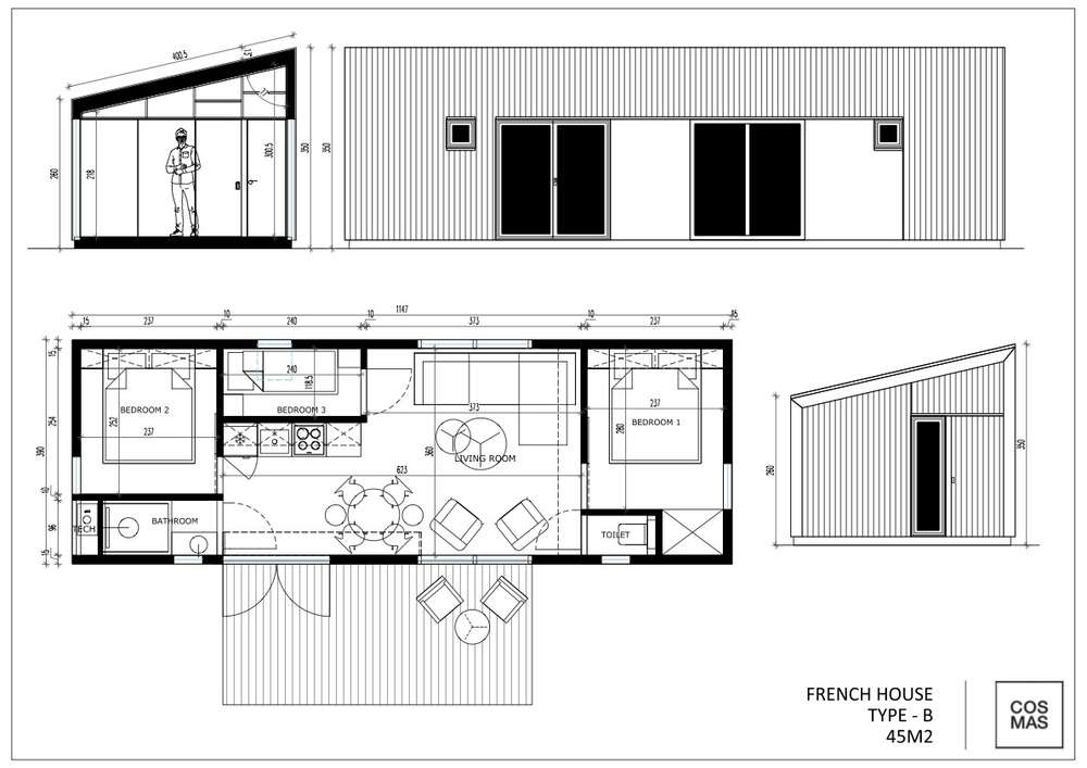 Leisure Lodge 45m² is a modular house built by Tiny House World, a prefab manufacturer based in the Netherlands. This prefab house provides 35 m² of living space, with 3 bedrooms and 1 bathroom. For further information, please check the technical description below.