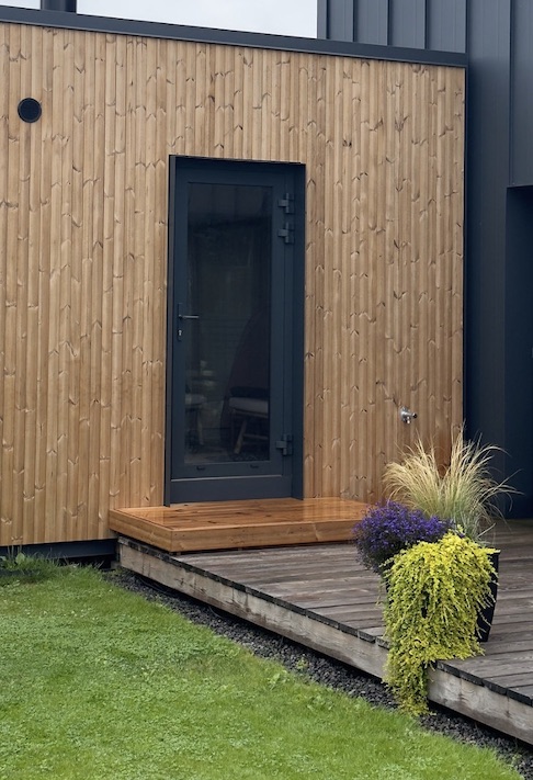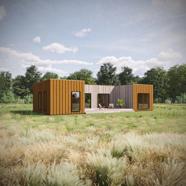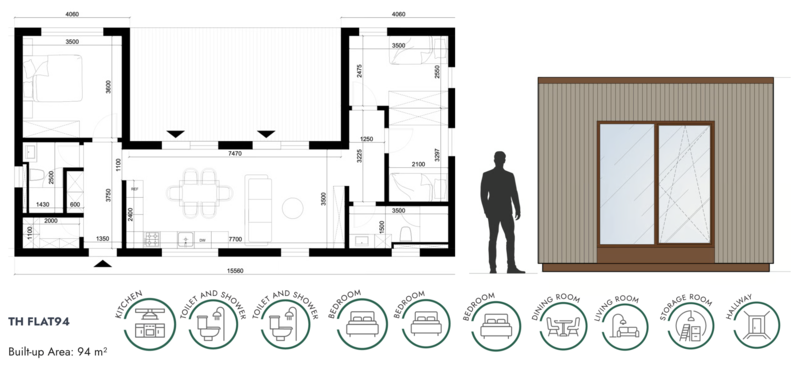 TH FLAT94 is a modular cabin built by tutumHOUSE, a prefab manufacturer based in Lithuania. This cabin provides 94 m2 of living space, with three bedrooms and two bathrooms.