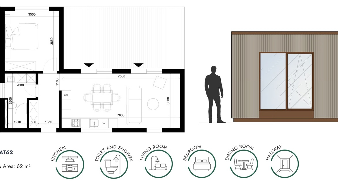 THFLAT62 is a modular cabin built by tutumHOUSE, a prefab manufacturer based in Lithuania. This cabin provides 62 m2 of living space, with one bedroom and one bathroom.