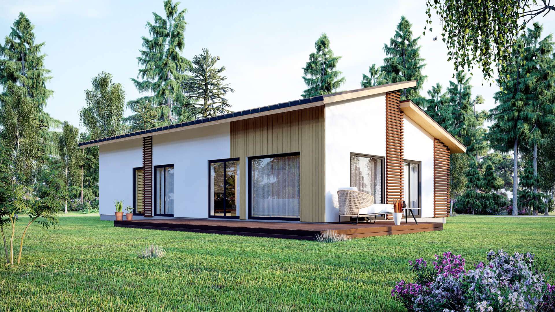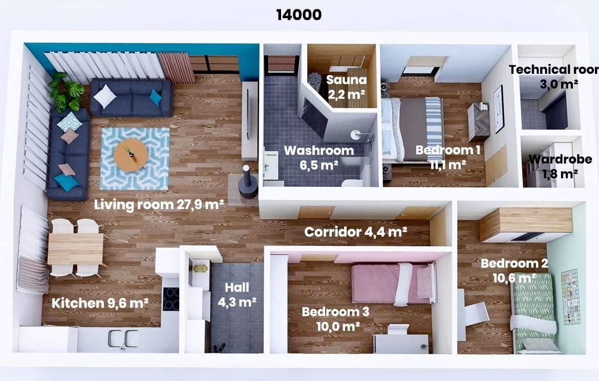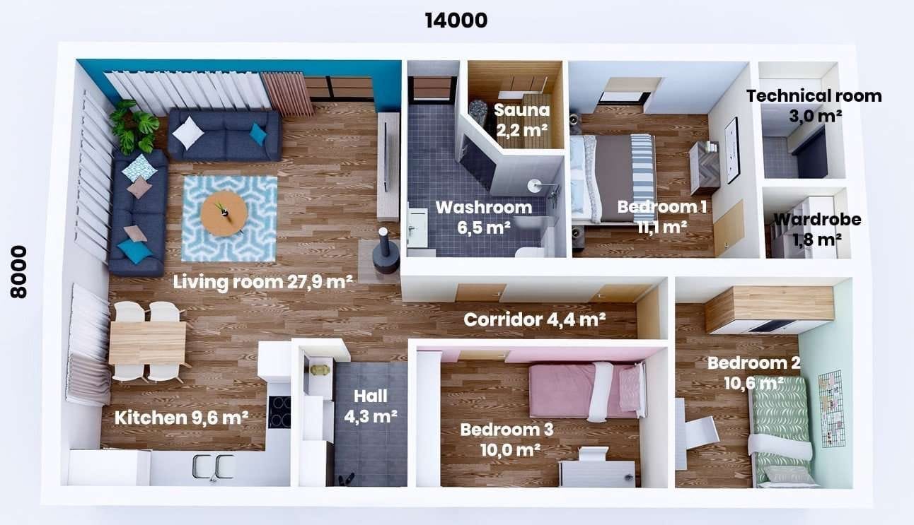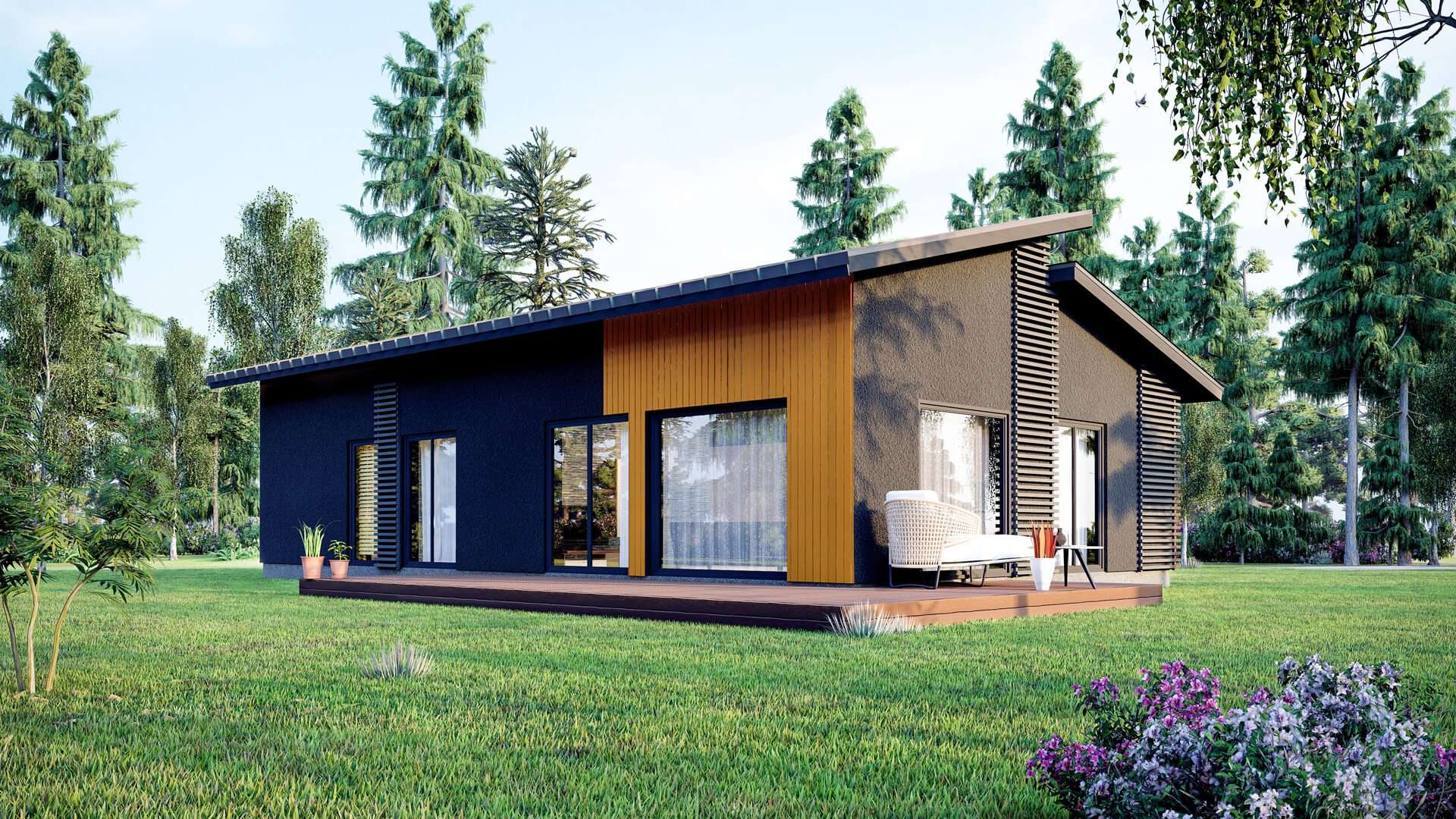 Stella 1-112 is een modulaire woning gebouwd door Akso-Haus, een prefab fabrikant gevestigd in Estland. Deze modulaire woning biedt 92,2 m² woonruimte met drie slaapkamers en een badkamer.