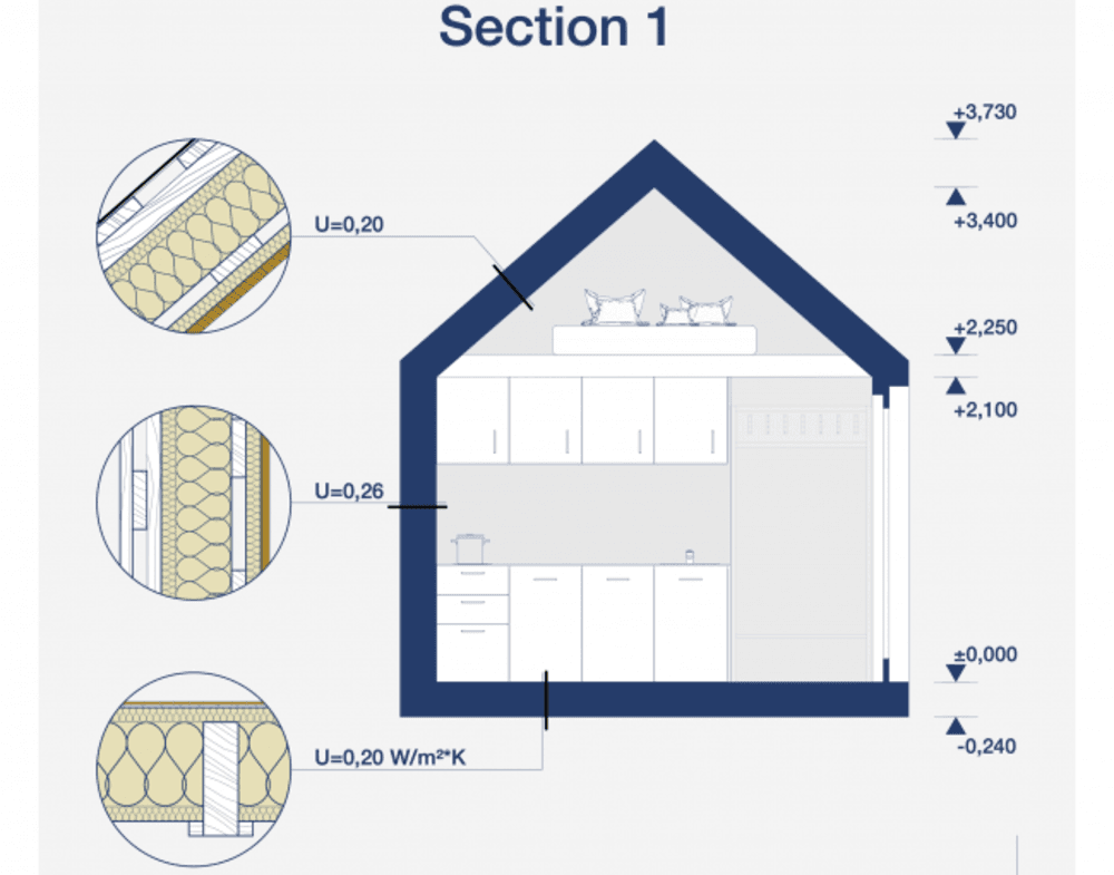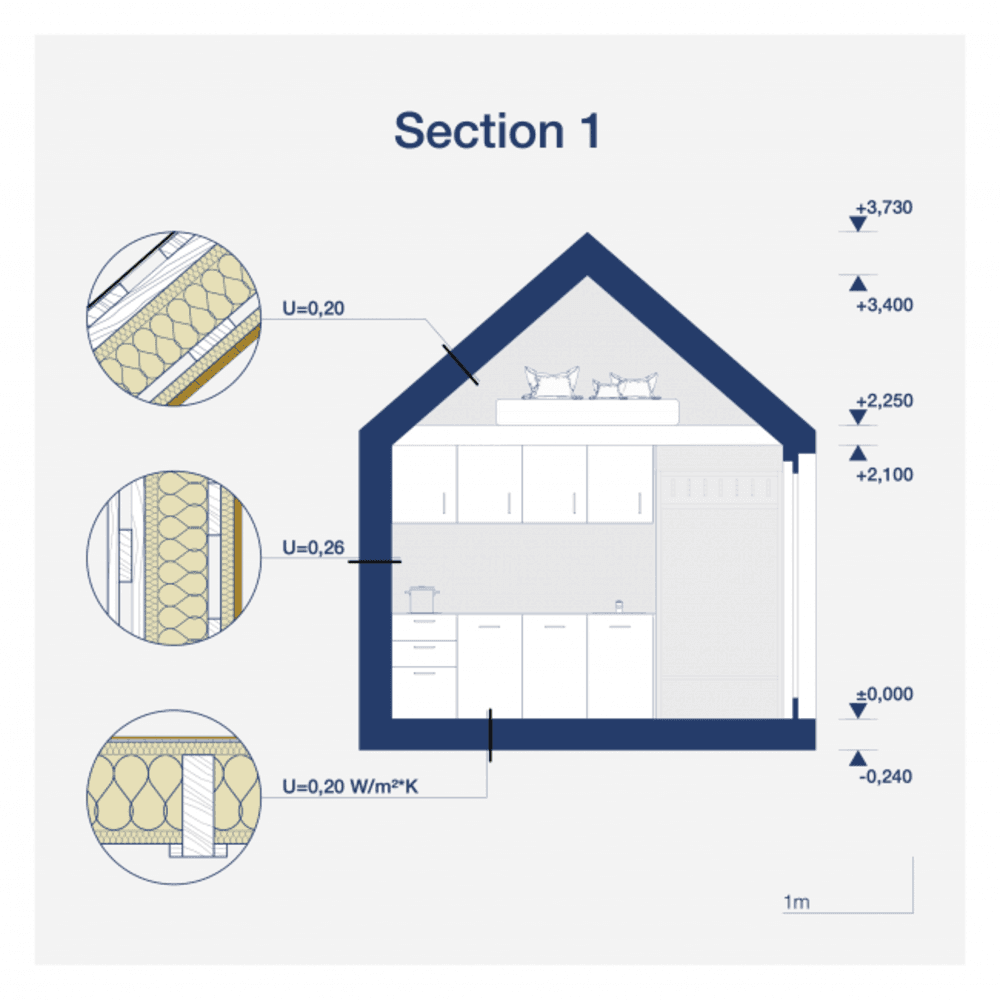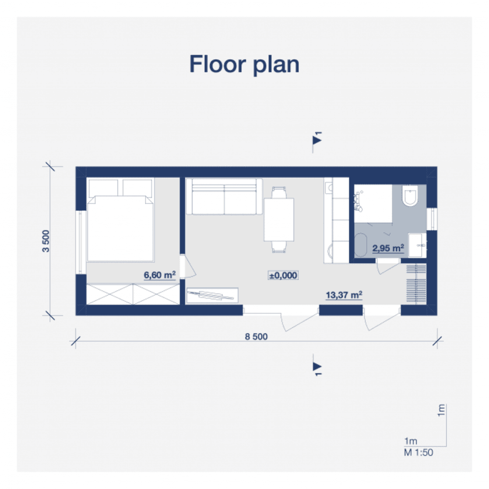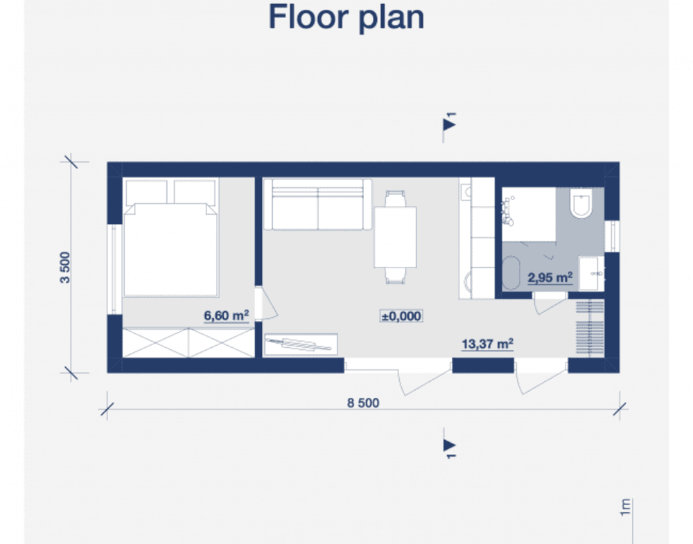 Frederika is een modulaire hut gebouwd door Tiny House Factory, een prefab Fabrikant gevestigd in Letland. Deze modulaire woning biedt 37,2 m² woonruimte, met een slaapkamer en een badkamer.