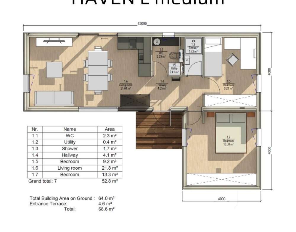 Haven L-Medium is een modulaire woning gebouwd door VMS houses, een prefab fabrikant gevestigd in Letland. Dit huis biedt 64 m² woonruimte, met 2 slaapkamers en 1 badkamer.