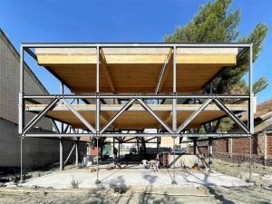 Creneas’ struktur er en leksjon i industriell presisjon i den naturlige komfortens tjeneste. Overbygningen er laget av krysslaminert tre (CLT), et materiale som kombinerer styrke, letthet og fornybar opprinnelse. Prefabrikkerte paneler ble kappet og klargjort utenfor byggeplassen, og deretter satt sammen med tørre skjøter, noe som minimerte avfallet og muliggjorde rask installasjon.