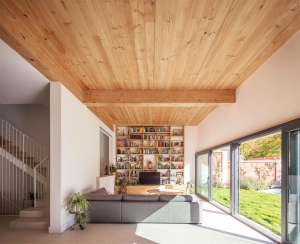 Store glassåpninger på den sørlige fasaden rammer inn utsikten mot hagen, mens mindre, mer kontrollerte åpninger mot nord reduserer varmetapet. Det dobbelthøye oppholdsrommet utnytter passiv ventilasjon, der varm luft stiger opp og slipper ut gjennom de øvre vinduene om sommeren.