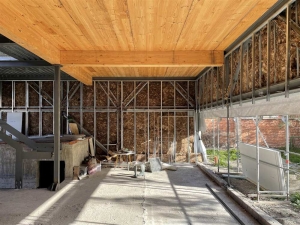 Et stålfagverk bygger bro over hovedspennet og overfører lastene direkte til betongveggene. Dette hybridsystemet – stål under, tømmer over – balanserer fleksibilitet og holdbarhet samtidig som husets vekt holdes lav. Den tørre byggemetoden betyr også at fremtidig vedlikehold eller endringer kan håndteres med minimale forstyrrelser.