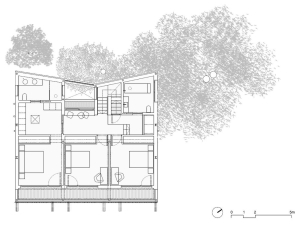Ved å konsentrere belastningen langs disse to linjene unngikk arkitektene å forstyrre rotsonene. De skjøv også bygningen nordover mot gaten, slik at den sørlige hagen fikk maksimalt med sollys og uteliv.