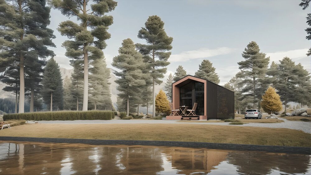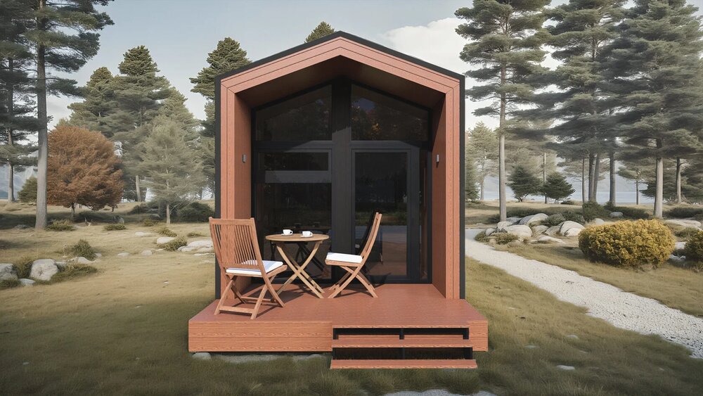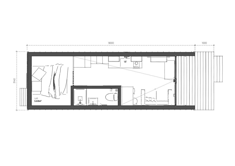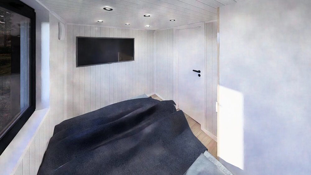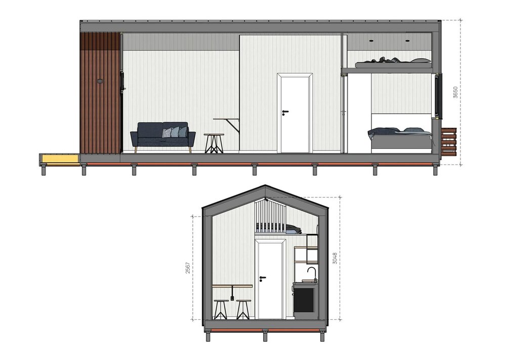 Dette prefab-huset har et boareal på 30 m² + 5,6 m² hems, med 1 soverom, 1 bad og et soveområde på hemsen.