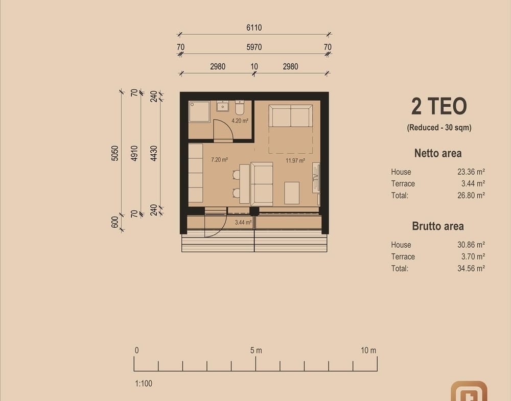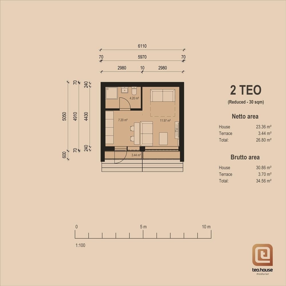 2 Teo Reduced er et ferdighus bygget av CompactLiving, en ferdighusprodusent med base i Estland. Dette ferdighuset har et boareal på 31 m² med plass til 2 personer.