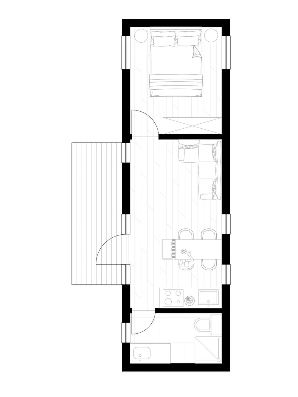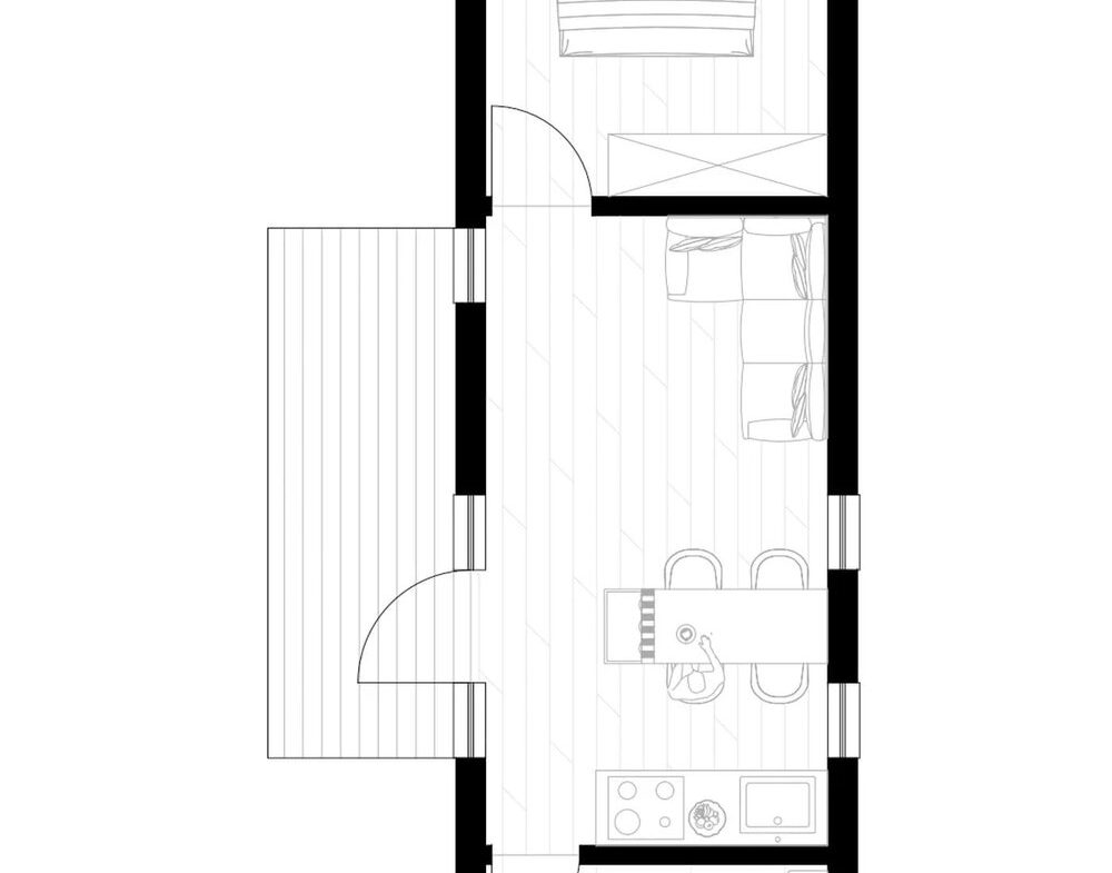 Dette prefab-huset har et boareal på 33,6 m², med 1 soverom og 1 bad.