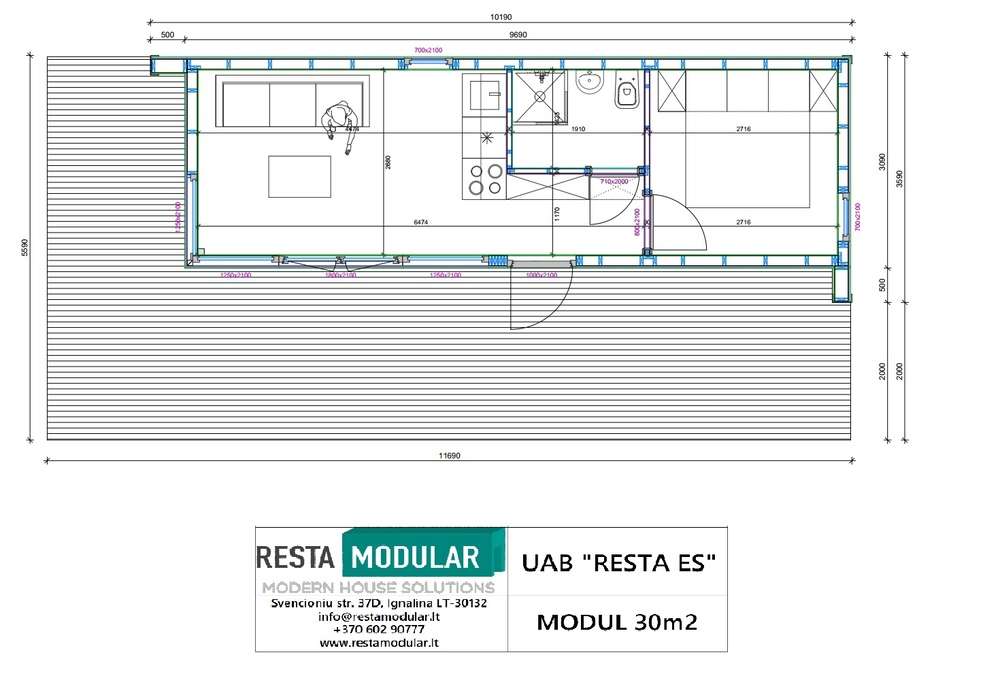 Modul 30 m² er et modulhus bygget av Resta ES, en prefabprodusent med base i Litauen. Dette modulhuset har et boareal på 30 m² med ett soverom og ett bad.
