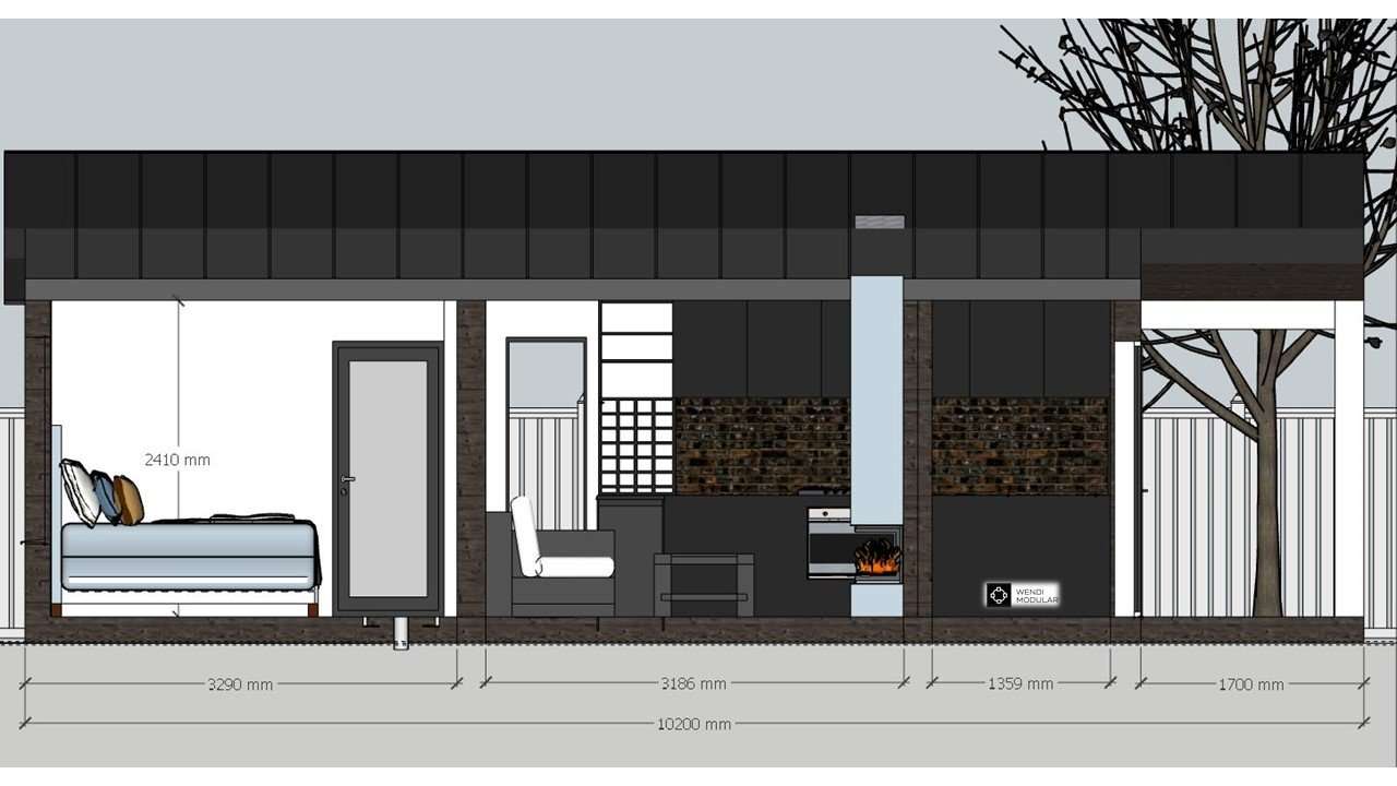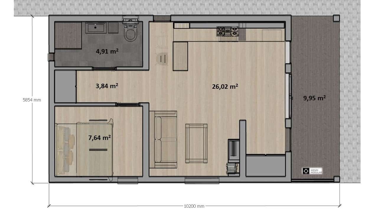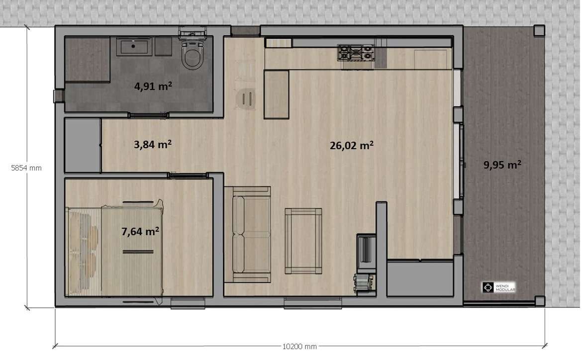 Eva House er et modulhus bygget av Wendi Modular, en ferdighusprodusent med base i Latvia. Dette modulhuset har et boareal på 42,37 m² med ett soverom og ett bad.