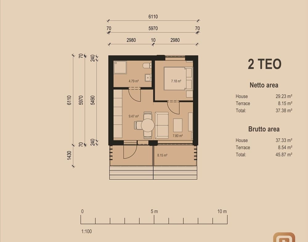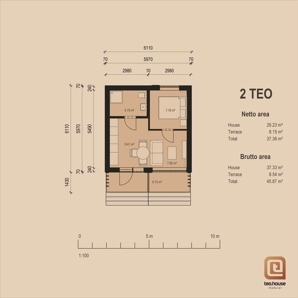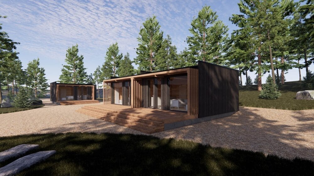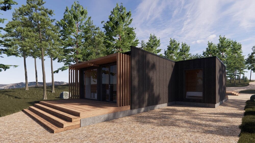 2 Teo är ett prefabricerat hus byggt av CompactLiving, en tillverkare av prefabricerade hus i Estland. Detta prefabricerade hus erbjuder 37 m² boyta med 1 sovrum och 1 badrum.
